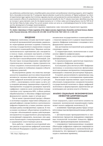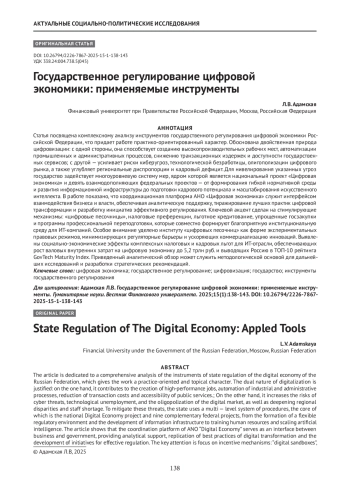 Статья посвящена комплексному анализу инструментов государственного регулирования цифровой экономики Российской Федерации, что придает работе практико-ориентированный характер. Обоснована двойственная природа цифровизации: с одной стороны, она способствует созданию высокопроизводительных рабочих мест, автоматизации промышленных и административных процессов, снижению транзакционных издержек и доступности государственных сервисов; с другой — усиливает риски киберугроз, технологической безработицы, олигополизации цифрового рынка, а также углубляет региональные диспропорции и кадровый дефицит. Для нивелирования указанных угроз государство задействует многоуровневую систему мер, ядром которой является национальный проект «Цифровая экономика» и девять взаимодополняющих федеральных проектов — от формирования гибкой нормативной среды и развития информационной инфраструктуры до подготовки кадрового потенциала и масштабирования искусственного интеллекта. В работе показано, что координационная платформа АНО «Цифровая экономика» служит интерфейсом взаимодействия бизнеса и власти, обеспечивая аналитическую поддержку, тиражирование лучших практик цифровой трансформации и разработку инициатив эффективного регулирования. Ключевой акцент сделан на стимулирующие механизмы: «цифровые песочницы», налоговые преференции, льготное кредитование, упрощенные госзакупки и программы профессиональной переподготовки, которые совместно формируют благоприятную институциональную среду для ИТ-компаний. Особое внимание уделено институту «цифровых песочниц» как форме экспериментальных правовых режимов, минимизирующих регуляторные барьеры и ускоряющих коммерциализацию инноваций. Выявлены социально-экономические эффекты комплексных налоговых и кадровых льгот для ИТ-отрасли, обеспечивающих рост валовых внутренних затрат на цифровую экономику до 5,2 трлн руб. и выводящих Россию в ТОП-10 рейтинга GovTech Maturity Index. Приведенный аналитический обзор может служить методологической основой для дальнейших исследований и разработки стратегических рекомендаций.