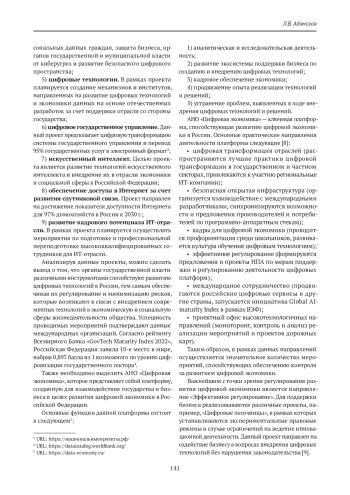 6. Палагин Н. В., Носков В. А. Обзор национального проекта «Цифровая экономика»: цели и задачи. Экономика и управление: проблемы, решения. 2022;1(4):182-189. URL: https://www.elibrary.ru/ydktgs
