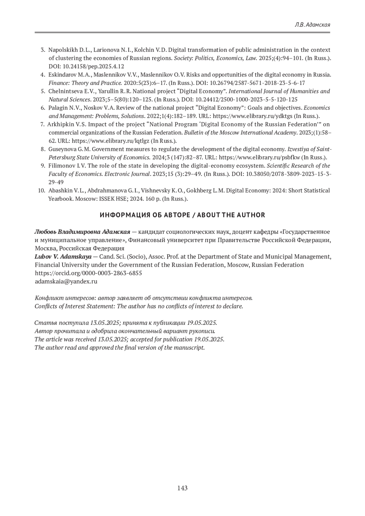 3. Напольских Д. Л., Ларионова Н. И., Колчин В. Д. Цифровая трансформация системы государственного управления в контексте задач кластеризации экономики российских регионов. Общество: политика, экономика, право. 2025;4:94-101. https://doi.org/10.24158/pep.2025.4.12