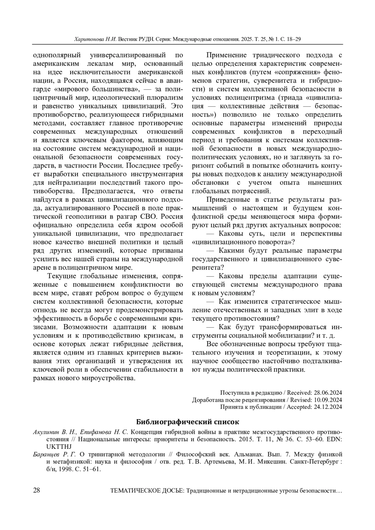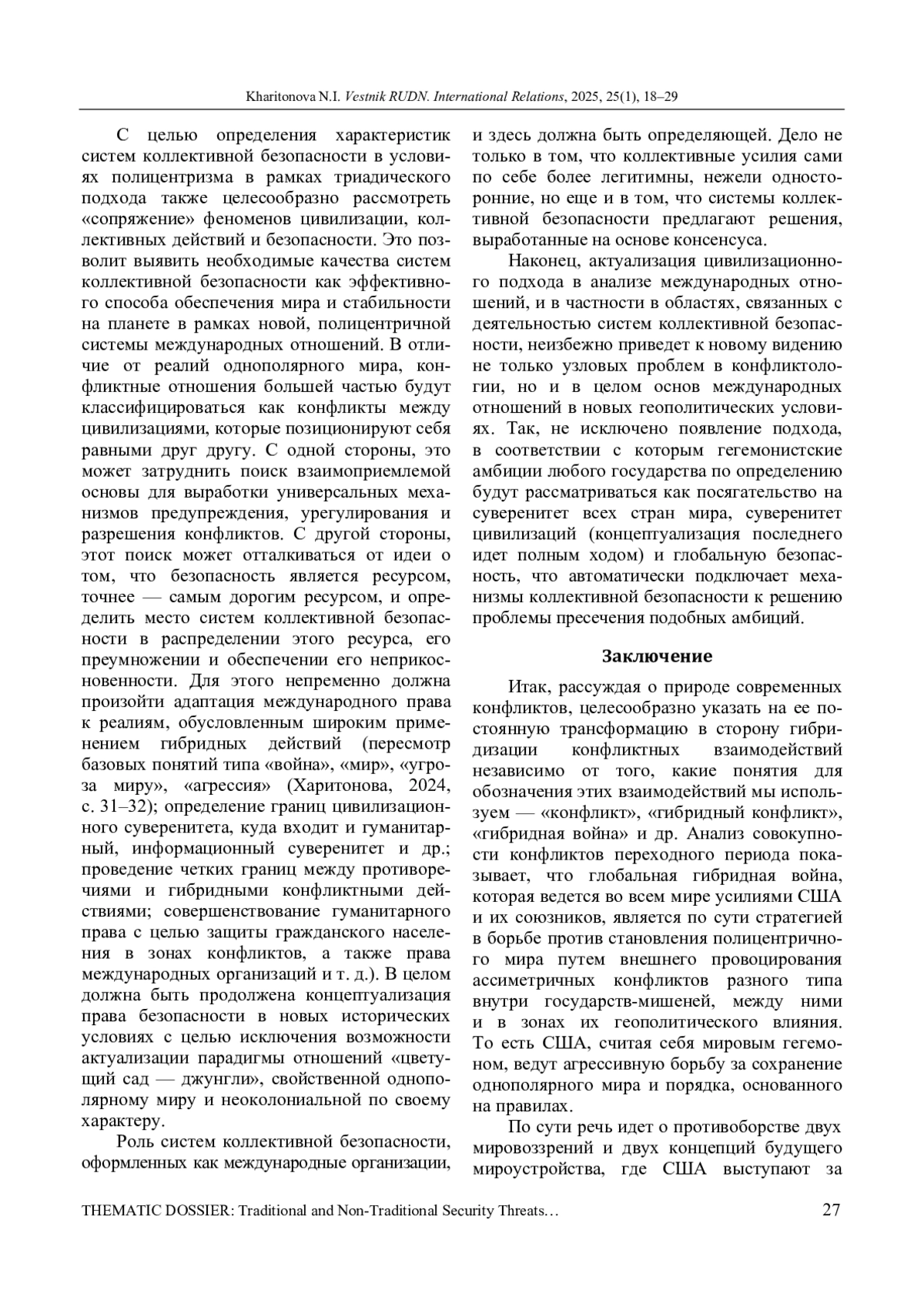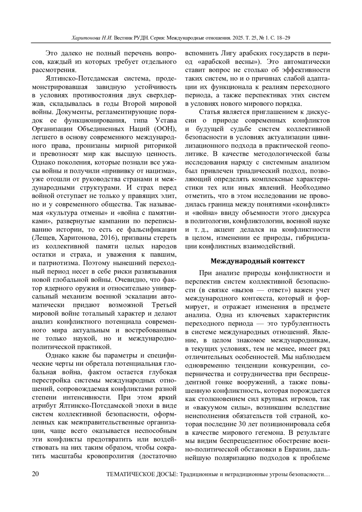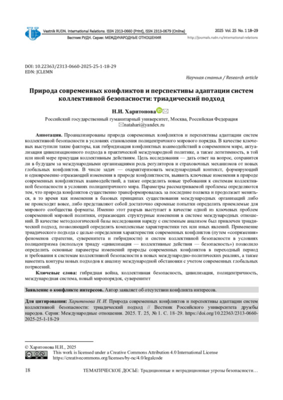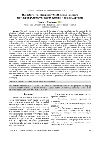 ХАРИТОНОВА Н. И. ПРИРОДА СОВРЕМЕННЫХ КОНФЛИКТОВ И ПЕРСПЕКТИВЫ АДАПТАЦИИ СИСТЕМ КОЛЛЕКТИВНОЙ БЕЗОПАСНОСТИ: ТРИАДИЧЕСКИЙ ПОДХОД // ВЕСТНИК РОССИЙСКОГО УНИВЕРСИТЕТА ДРУЖБЫ НАРОДОВ. СЕРИЯ: МЕЖДУНАРОДНЫЕ ОТНОШЕНИЯ. 2025. ТОМ 25 № 1