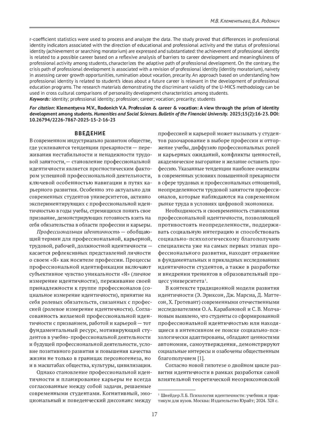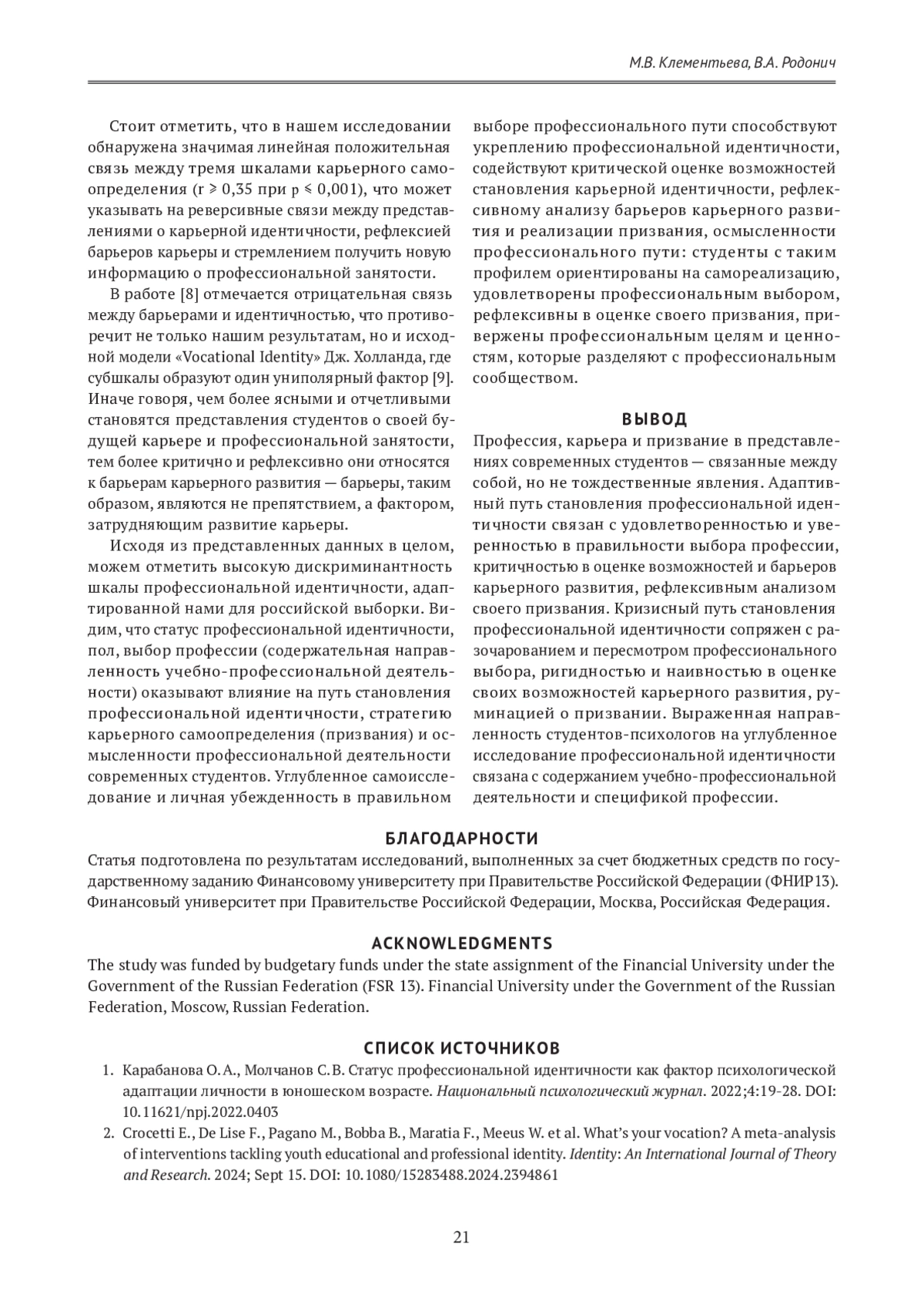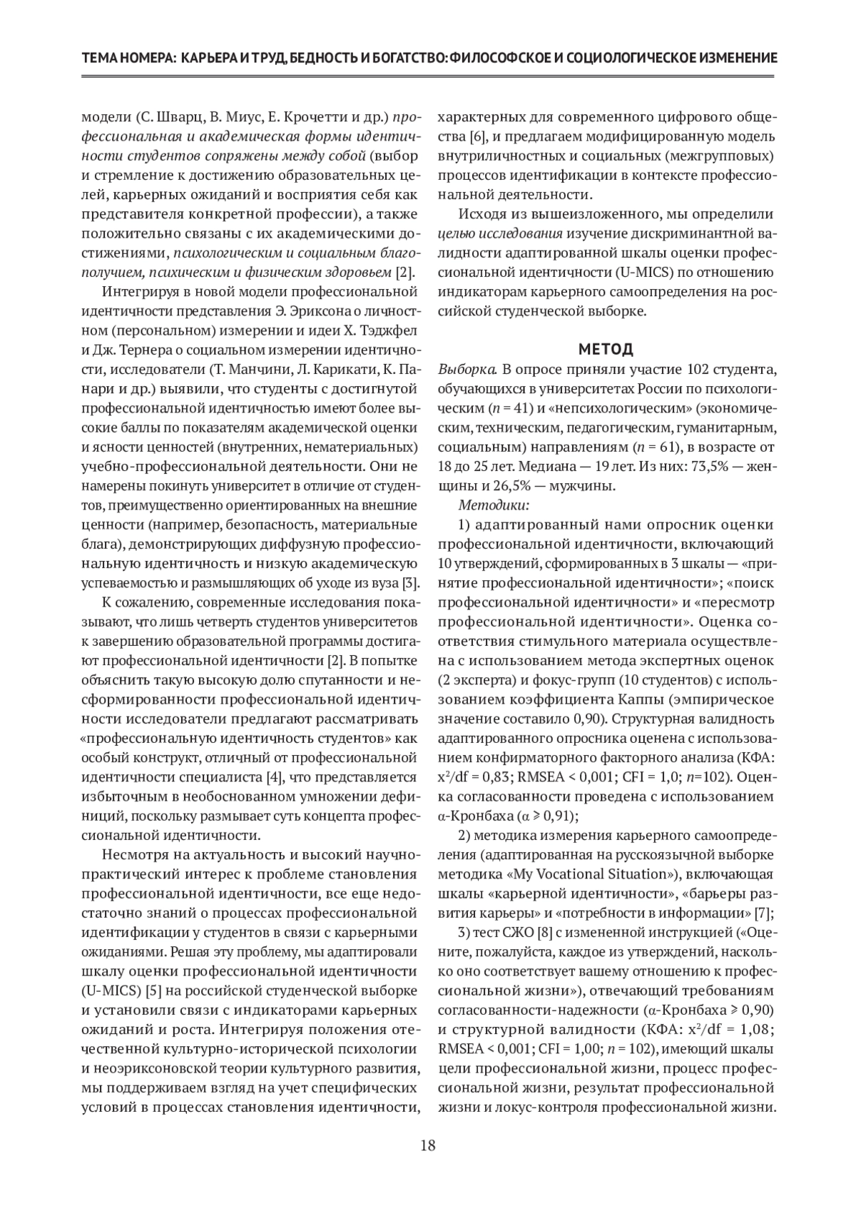 В технологически развитом мире становление профессиональной идентичности и планирование карьеры — задачи, решаемые во время учебы в вузе. Предыдущие исследования установили, что неадаптивные процессы формирования профессиональной идентичности и планирования будущей карьеры в студенческом возрасте побуждают учащихся покинуть университет, но мало известно об индикаторах карьерного призвания, ассоциированных с профессиональной идентичностью и смыслами профессиональной жизни среди студентов. Цель настоящей работы — оценка дискриминантной валидности адаптированной шкалы оценки профессиональной идентичности (U-MICS) по отношению к индикаторам карьерного призвания и осмысленности профессиональной жизни на выборке российского студенчества (n = 102). Опросный метод позволил измерить показатели профессиональной идентичности (поиск, принятие и переосмысление), смысложизненных ориентаций в профессиональной деятельности (цель, процесс, результат, локус контроля) и карьерного призвания (карьерная идентичность, барьеры развития карьеры и потребности в информации). Для обработки и анализа данных использована статистика t-критерия стьюдента и r-критерия Пирсона. В результате исследования доказано, что различия в показателях профессиональной идентичности, связанные с направлением учебно-профессиональной деятельности и статусом профессиональной идентичности, выражены и обоснованы: достижение профессиональной идентичности соотносится с возможной карьерой на основе рефлексивного анализа барьеров карьерного развития и осмысленностью профессиональной деятельности среди студентов, характеризует адаптивный путь профессионального развития. Напротив, кризисный путь профессионального развития сопряжен с пересмотром профессиональной идентичности (мораторием идентичности), наивностью в оценке возможностей карьерного роста, руминацией о призвании, прекарностью. Подход, основанный на понимании, как профессиональная идентичность связана с представлениями студентов о будущей карьере, является актуальным при разработке программ профессионального образования. Материалы исследования, демонстрирующие дискриминантную валидность методики U-MICS, могут быть использованы в межкультурных сравнениях особенностей развития личности среди студентов.