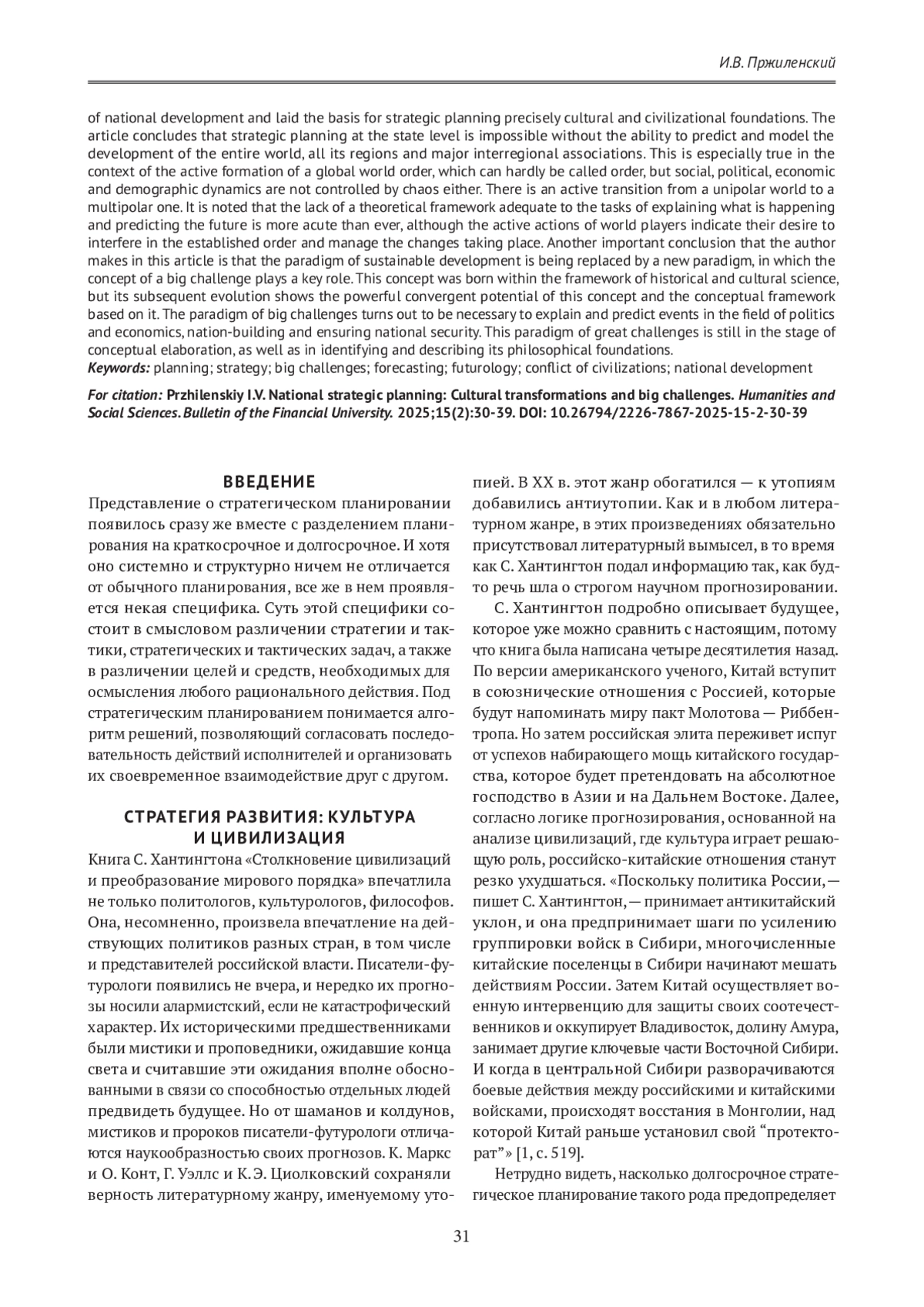 В статье рассмотрены вопросы стратегического планирования национального развития в социально-философском дискурсе культурных трансформаций. Суть специфики национального стратегического планирования состоит в смысловом разграничении стратегии и тактики, стратегических и тактических задач, а также в различении целей и средств, необходимых для осмысления любого рационального действия. В статье поднимаются такие вопросы, как прогнозирование социальных и политических процессов, футурологические подходы к прогнозам и выстраивание прогнозов на основании цивилизационного подхода. В частности, для сравнения автор приводит труды американских и отечественных философов и политологов, дававших прогнозы национального развития и закладывавших в основу стратегического планирования именно культурные, цивилизационные основания. В статье делается вывод, что стратегическое планирование на уровне государства невозможно без способности прогнозирования и моделирования развития всего мира, всех его регионов и основных межрегиональных объединений. Это особенно актуально в условиях активного формирования глобального миропорядка, который вряд ли можно назвать порядком, но при этом текущая социальная, политическая, экономическая и демографическая динамика не является управляемым хаосом. Идет активный переход от однополярного мира к многополярному. Отмечается, что как никогда остро ощущается нехватка теоретической базы, адекватно объясняющей задачи происходящего и прогнозирующей будущее, хотя активные действия мировых игроков свидетельствуют об их стремлении вмешиваться в сложившиеся порядки и управлять происходящими изменениями. Еще один важный вывод, сделанный автором в настоящей статье, состоит в том, что на смену парадигме устойчивого развития приходит новая, ключевую роль в которой играет понятие «большие вызовы». Это понятие рождается в рамках исторической и культурологической наук, но его последующая эволюция показывает мощный конвергентный потенциал данного концепта и выстраиваемого на его основе концептуального каркаса. Парадигма больших вызовов необходима для объяснения и прогнозирования событий в сфере политики и экономики, государственного строительства и обеспечения национальной безопасности. Данная парадигма больших вызовов все еще находится в стадии концептуальной проработки, а также в выявлении и описании ее философских оснований.