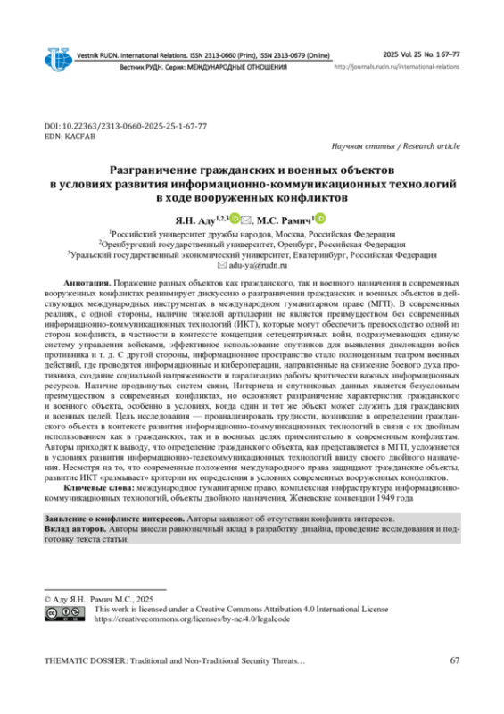 Цель исследования - проанализировать трудности, возникшие в определении гражданского объекта в контексте развития информационно-коммуникационных технологий в связи с их двойным использованием как в гражданских, так и в военных целях применительно к современным конфликтам. Авторы приходят к выводу, что определение гражданского объекта, как представляется в МГП, усложняется в условиях развития информационно-телекоммуникационных технологий ввиду своего двойного назначения. Несмотря на то, что современные положения международного права защищают гражданские объекты, развитие ИКТ «размывает» критерии их определения в условиях современных вооруженных конфликтов.