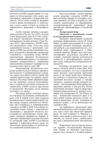 Аналогичную позицию занимают А. З. Нагимова [8] и А. Х. Умаров [16], которые акцентируют внимание на недостаточной прозрачности и нормативной неопределённости в сфере исламского финансирования в России. Они подчёркивают, что отсутствие стандартизированной отчётности, сопоставимой со стандартами AAOIFI, снижает доверие со стороны инвесторов из исламских стран, ориентированных на признанные формы шариатского комплаенса. Вопросы нормативного и институционального сопровождения исламского банкинга рассматриваются и в работе Н. А. Львовой, где подчёркивается необходимость законодательной проработки механизмов адаптации исламских инструментов к гражданскому и налоговому праву Российской Федерации [7]. Тем не менее, вопрос прямого применения стандартов AAOIFI в России вплоть до недавнего времени практически не поднимался в литературе.