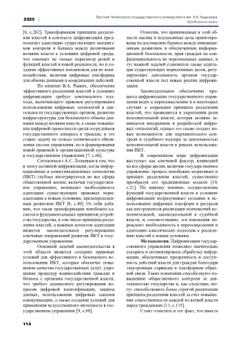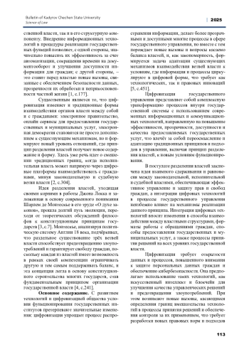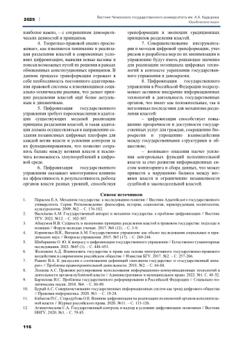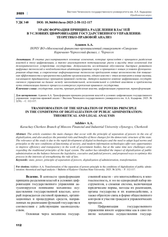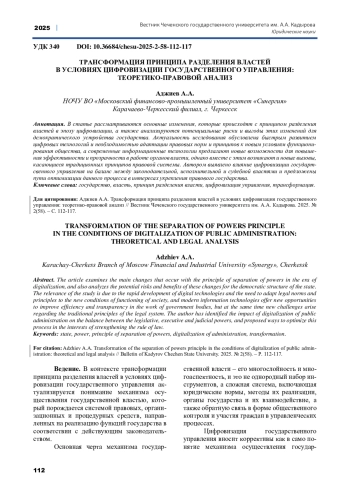 АДЖИЕВ А.А. ТРАНСФОРМАЦИЯ ПРИНЦИПА РАЗДЕЛЕНИЯ ВЛАСТЕЙ В УСЛОВИЯХ ЦИФРОВИЗАЦИИ ГОСУДАРСТВЕННОГО УПРАВЛЕНИЯ: ТЕОРЕТИКО-ПРАВОВОЙ АНАЛИЗ // ВЕСТНИК ЧЕЧЕНСКОГО ГОСУДАРСТВЕННОГО УНИВЕРСИТЕТА ИМ. А. А. КАДЫРОВА. 2025. № 2 (58)