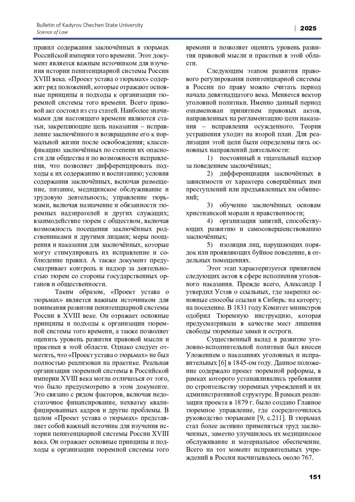 1. Васильева С. “Проект устава о тюрьмах” Екатерины II в контексте европейской пенитенциарной мысли [Электронный ресурс]. URL: https://elar.urfu.ru/bitstream/10995/109695/1/qr_1_2022_11.pdf (дата обращения 01.02.2025).