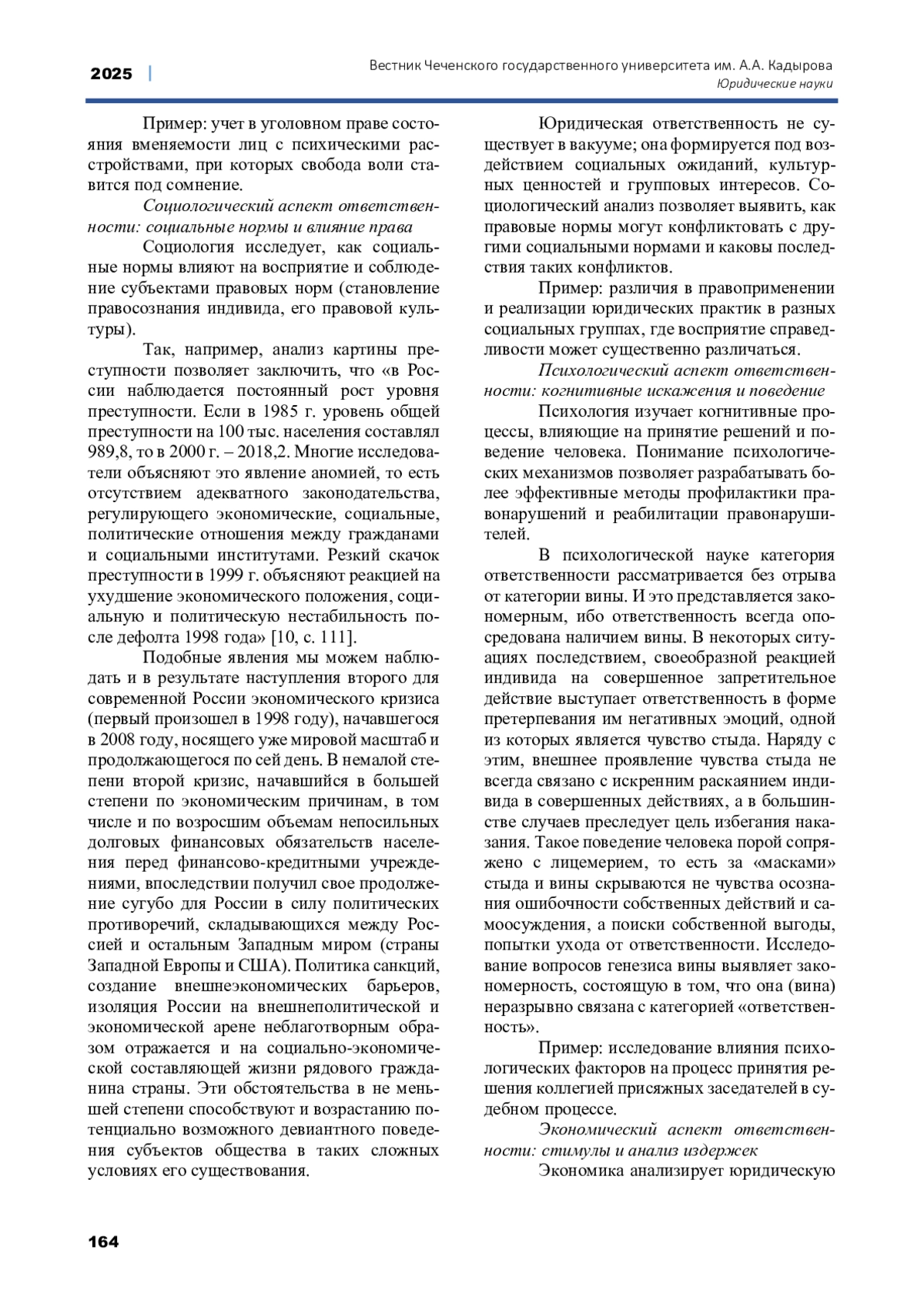 В эпоху стремительных изменений и глобальных вызовов, когда границы между дисциплинами и научными категориями стираются, а общественные вызовы становятся все более сложными, традиционное понимание юридической ответственности требует переосмысления, учитывая, что такое понимание является краеугольным камнем стабильного правопорядка и справедливого общества. Данная статья предлагает междисциплинарный подход к трактовке юридической ответственности, интегрируя идеи из философии, социологии, психологии и экономики для обогащения правового анализа и понимания глубинных мотивов, формирующих человеческое поведение и влияющих на правоприменение. Мы исследуем, как современные вызовы влияют на концепцию ответственности и требуют ее адаптации к новым реалиям. В статье не только анализируются текущие проблемы, но и предлагается проспективный взгляд на развитие юридической ответственности, рассматривая, как такой подход может быть использован для достижения более справедливого и устойчивого будущего. Данная статья - приглашение к участию в непрерывном диалоге о сущности права и такого важного его института, как юридическая ответственность, о его границах и его будущем.