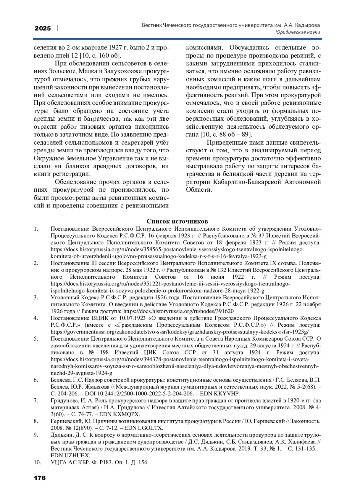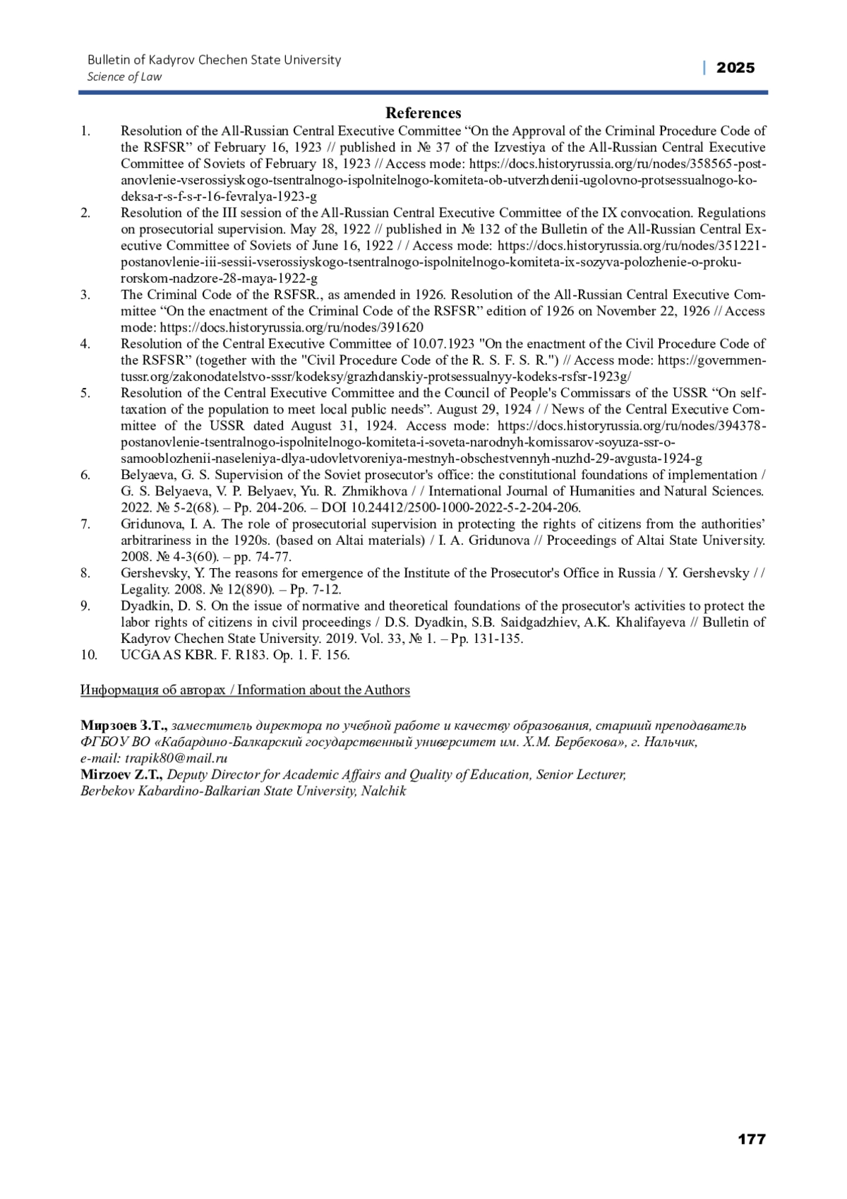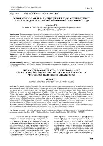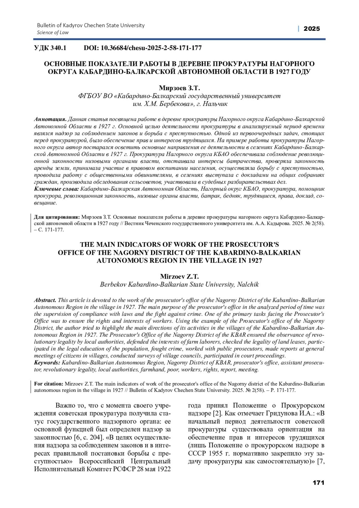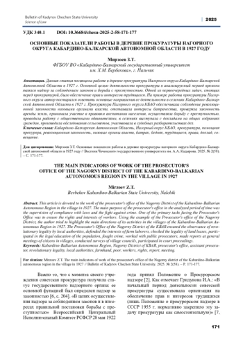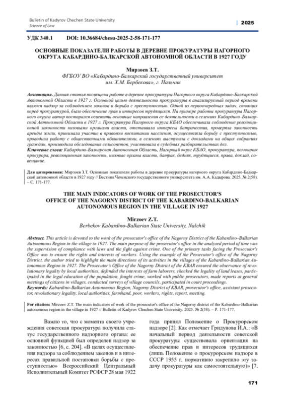 МИРЗОЕВ З.Т. ОСНОВНЫЕ ПОКАЗАТЕЛИ РАБОТЫ В ДЕРЕВНЕ ПРОКУРАТУРЫ НАГОРНОГО ОКРУГА КАБАРДИНО-БАЛКАРСКОЙ АВТОНОМНОЙ ОБЛАСТИ В 1927 ГОДУ // ВЕСТНИК ЧЕЧЕНСКОГО ГОСУДАРСТВЕННОГО УНИВЕРСИТЕТА ИМ. А. А. КАДЫРОВА. 2025. № 2 (58)