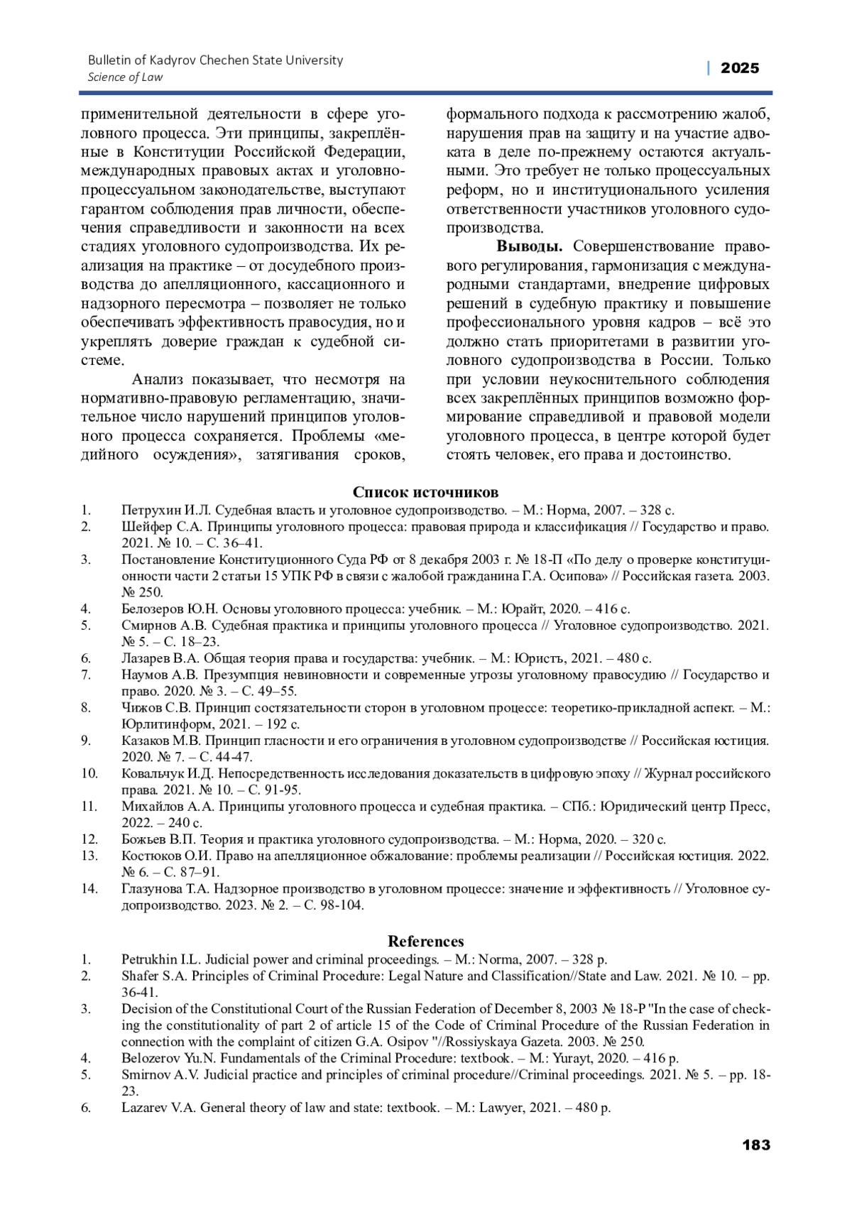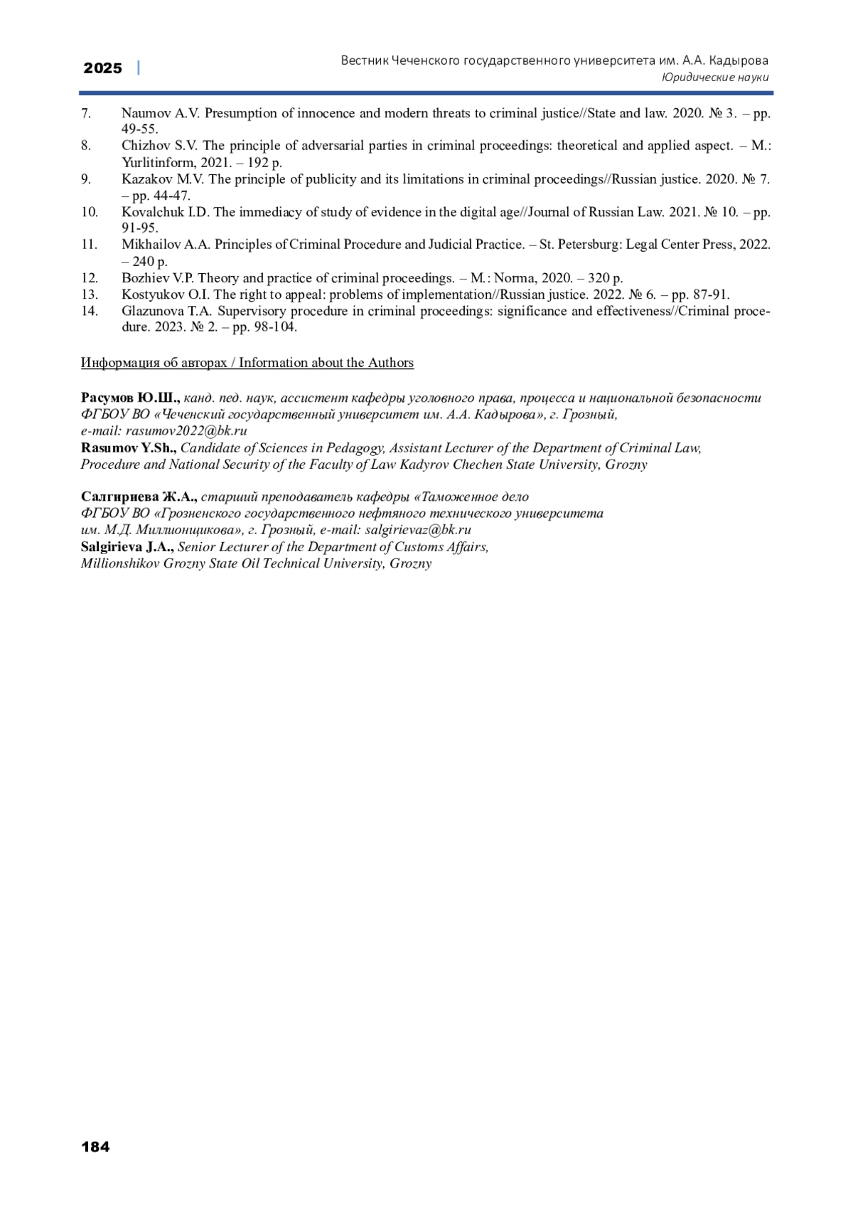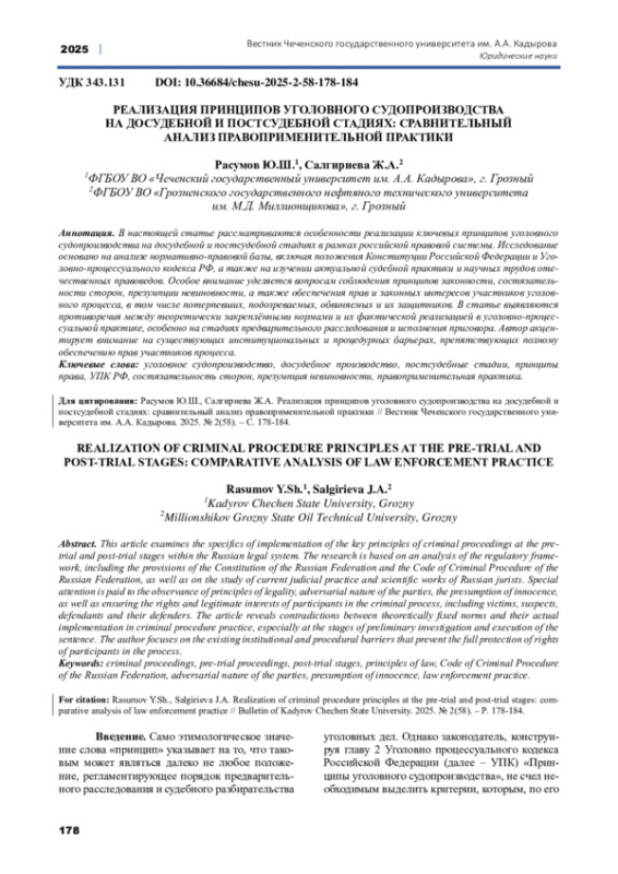 РАСУМОВ Ю.Ш., САЛГИРИЕВА Ж.А. РЕАЛИЗАЦИЯ ПРИНЦИПОВ УГОЛОВНОГО СУДОПРОИЗВОДСТВА НА ДОСУДЕБНОЙ И ПОСТСУДЕБНОЙ СТАДИЯХ: СРАВНИТЕЛЬНЫЙ АНАЛИЗ ПРАВОПРИМЕНИТЕЛЬНОЙ ПРАКТИКИ // ВЕСТНИК ЧЕЧЕНСКОГО ГОСУДАРСТВЕННОГО УНИВЕРСИТЕТА ИМ. А. А. КАДЫРОВА. 2025. № 2 (58)