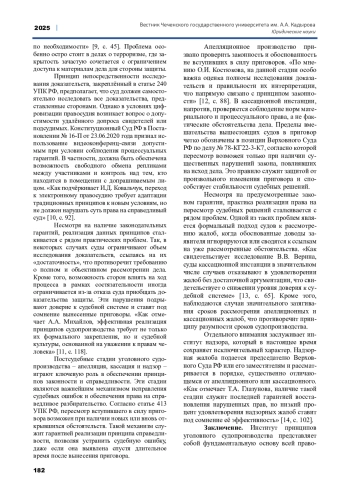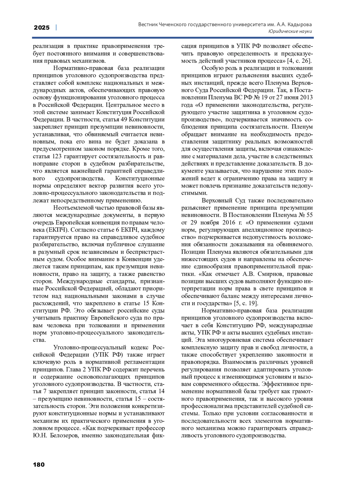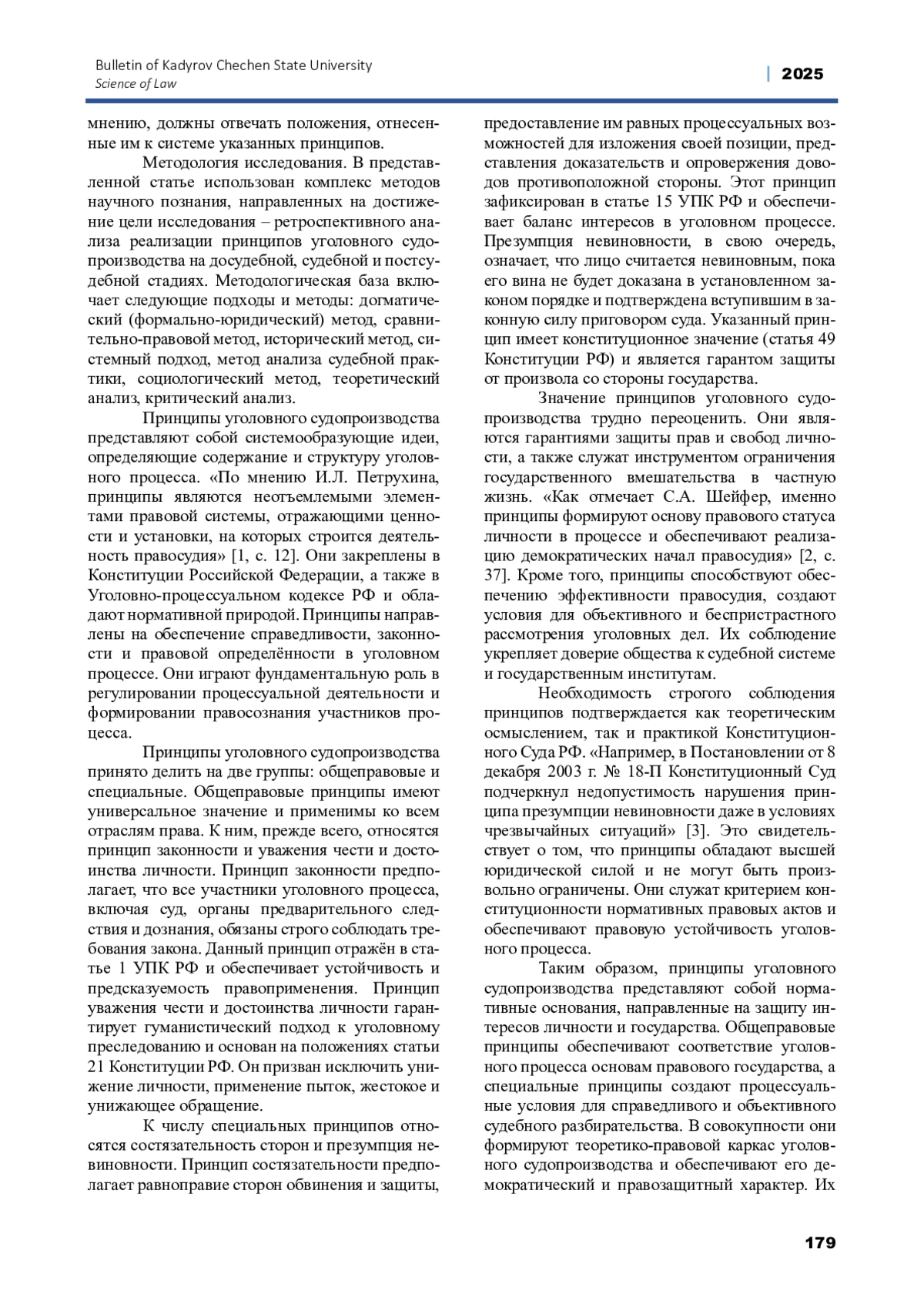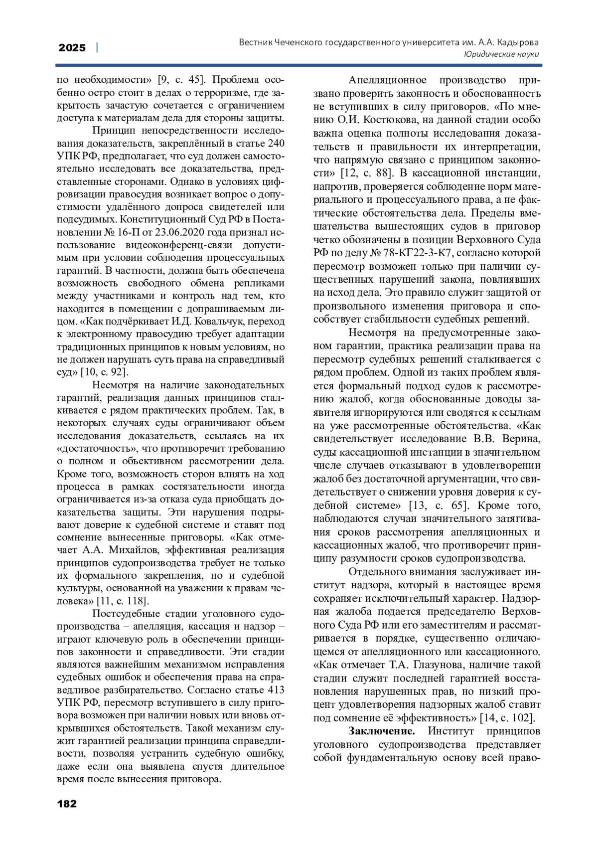 РАСУМОВ Ю.Ш., САЛГИРИЕВА Ж.А. РЕАЛИЗАЦИЯ ПРИНЦИПОВ УГОЛОВНОГО СУДОПРОИЗВОДСТВА НА ДОСУДЕБНОЙ И ПОСТСУДЕБНОЙ СТАДИЯХ: СРАВНИТЕЛЬНЫЙ АНАЛИЗ ПРАВОПРИМЕНИТЕЛЬНОЙ ПРАКТИКИ // ВЕСТНИК ЧЕЧЕНСКОГО ГОСУДАРСТВЕННОГО УНИВЕРСИТЕТА ИМ. А. А. КАДЫРОВА. 2025. № 2 (58)