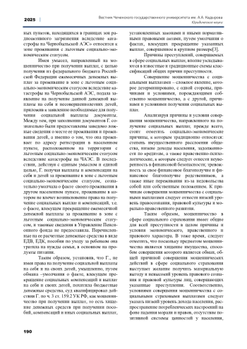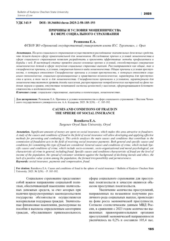 На цели социального страхования осуществляется расходование значительных денежных средств, что делает данную сферу привлекательной для мошенников. Исследование причин и условий мошенничества в сфере социального страхования позволит разработать и применять эффективные методы профилактики и борьбы с ней. В настоящей статье проведен анализ основных причин и условий, способствующих совершению мошеннических деяний в сфере получения социальных страховых выплат. Рассматриваются как общие, так и специфические причины, и условия, совершения данного вида мошенничества. Общие причины и условия преступности, к которым относятся Специфические причины и условия преступности, к которым относятся социально-экономические, социально-организационные и нравственно-психологические, характерны для преступности в целом, в том числе и для мошенничества.