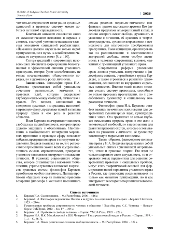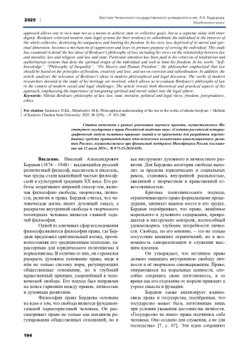 Настоящая статья посвящена комплексному анализу политико-правовых воззрений Николая Александровича Бердяева. Философия права Н. А. Бердяева представляет собой уникальную, глубокую и многогранную концепцию, которая не только выходит за рамки традиционных правовых подходов, но и акцентирует внимание на внутреннем духовном мире человека, его свободе и творческом потенциале. В центре философских размышлений Бердяева находится идея свободы личности, которая понимается им не как внешнее юридическое состояние, а как метафизическая и духовная основа человеческого бытия. Для Бердяева право - это не только инструмент регулирования общественных отношений, но и важнейший механизм, способствующий духовному и моральному росту личности. Он утверждал, что право должно быть тесно связано с христианскими ценностями и духовными принципами, поскольку только такой подход позволяет рассматривать человека не как средство для достижения государственных или коллективных целей, а как высшую ценность, обладающую внутренним достоинством. Бердяев критиковал современные государственно-правовые системы за их склонность подчинять личность интересам коллективного целого, разрушая её уникальность и ограничивая её свободу. По его мнению, право, лишённое морального и духовного измерения, превращается в механизм подавления и утрачивает свою основную цель - служить человеку. В рамках настоящего исследования были подробно рассмотрены ключевые идеи философии права Бердяева, включая его взгляды на соотношение права и морали, права и религии, а также права и государства, идеи Бердяева в контексте проблем современного уголовного права, были предложены пути интеграции его взглядов в реформирование системы наказания в России. Особое внимание уделено его критике тоталитарных и авторитарных систем, которые отрицают духовное начало личности и стремятся ограничить её свободу. В трудах «Самопознание», «Философия неравенства», «О рабстве и свободе человека» философ подчёркивал, что право должно быть основано на принципах свободы, творчества и любви, а не на принуждении и подчинении. Кроме того, в статье проведён анализ актуальности идей Бердяева в современном философском и правовом дискурсе. Привлекаются труды современных исследователей, посвящённые изучению его наследия, что позволяет оценить философию права Бердяева в контексте современных социальных и правовых вызовов. Статья раскрывает как теоретические, так и практические аспекты его подхода, подчёркивая важность интеграции духовных и моральных ценностей в правовую сферу.