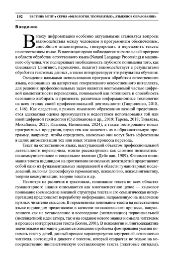 В эпоху цифровизации особенно актуальными становятся вопросы взаимодействия между человеком и программным обеспечением, способным анализировать, генерировать и переводить тексты на естественном языке. В настоящее время наблюдается значительный прогресс в области обработки естественного языка (Natural Language Processing) и машинного обучения, что подчеркивает необходимость глубокого понимания того, как специалист (лингвист, переводчик, педагог) взаимодействует с результатами обработки текстовых данных, а также интерпретирует эти результаты обучения.