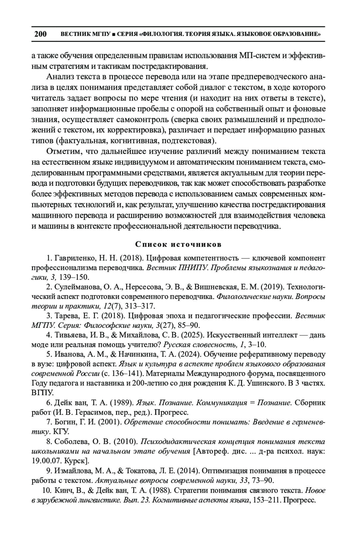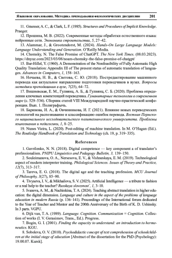 1. Гавриленко, Н. Н. (2018). Цифровая компетентность - ключевой компонент профессионализма переводчика. Вестник ПНИПУ. Проблемы языкознания и педагогики, 3, 139-150.
