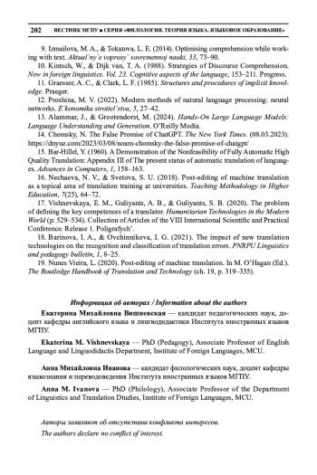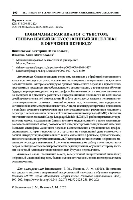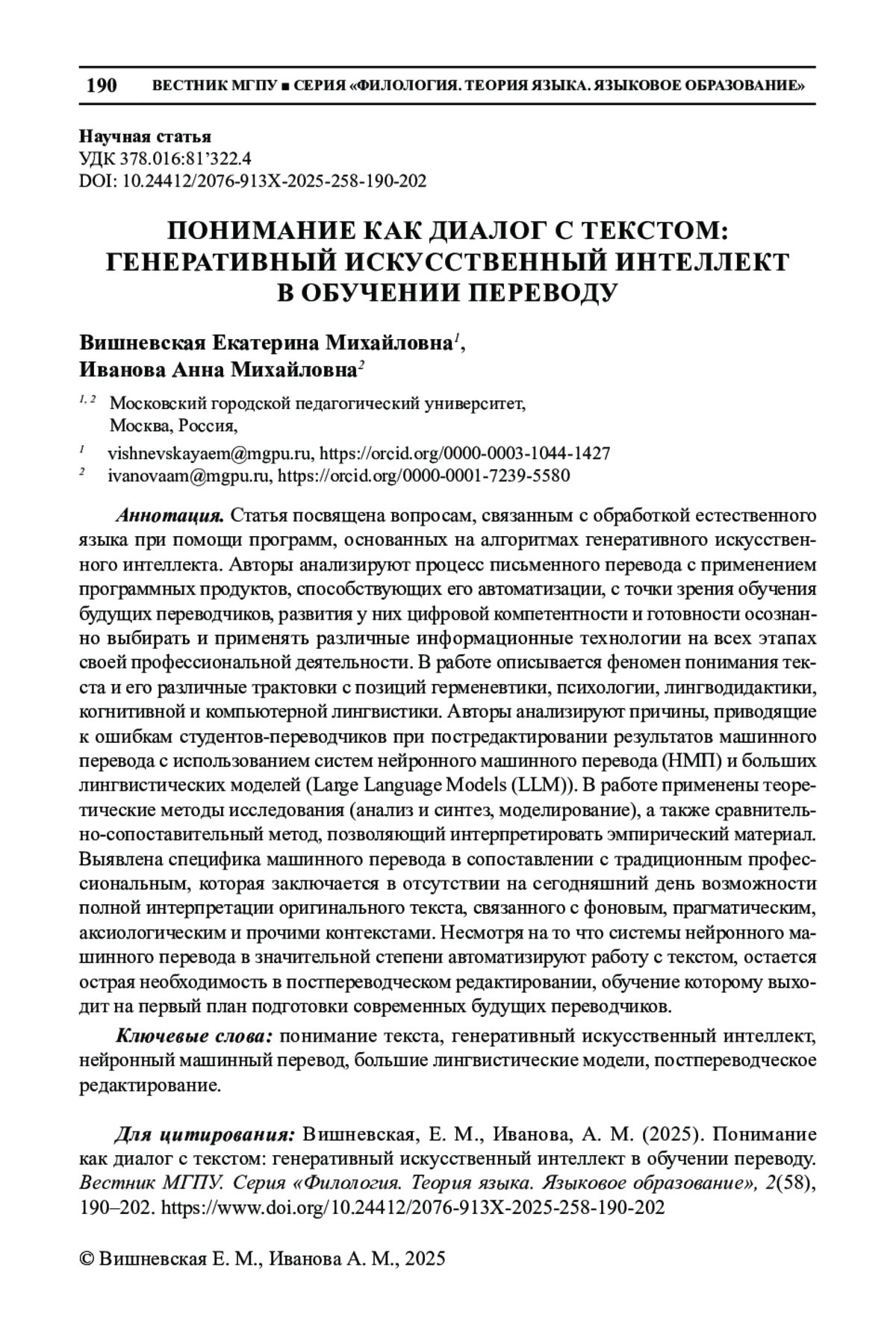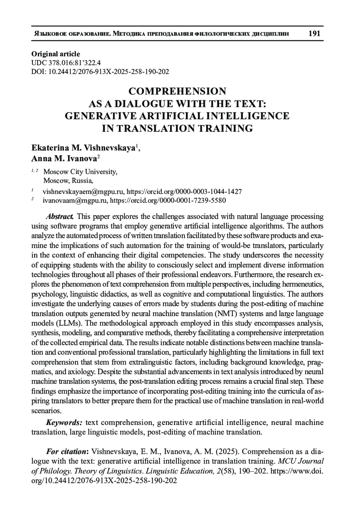 Статья посвящена вопросам, связанным с обработкой естественного языка при помощи программ, основанных на алгоритмах генеративного искусственного интеллекта. Авторы анализируют процесс письменного перевода с применением программных продуктов, способствующих его автоматизации, с точки зрения обучения будущих переводчиков, развития у них цифровой компетентности и готовности осознанно выбирать и применять различные информационные технологии на всех этапах своей профессиональной деятельности. В работе описывается феномен понимания текста и его различные трактовки с позиций герменевтики, психологии, лингводидактики, когнитивной и компьютерной лингвистики. Авторы анализируют причины, приводящие к ошибкам студентов-переводчиков при постредактировании результатов машинного перевода с использованием систем нейронного машинного перевода (НМП) и больших лингвистических моделей (Large Language Models (LLM)). В работе применены теоретические методы исследования (анализ и синтез, моделирование), а также сравнительно-сопоставительный метод, позволяющий интерпретировать эмпирический материал. Выявлена специфика машинного перевода в сопоставлении с традиционным профессиональным, которая заключается в отсутствии на сегодняшний день возможности полной интерпретации оригинального текста, связанного с фоновым, прагматическим, аксиологическим и прочими контекстами. Несмотря на то что системы нейронного машинного перевода в значительной степени автоматизируют работу с текстом, остается острая необходимость в постпереводческом редактировании, обучение которому выходит на первый план подготовки современных будущих переводчиков.