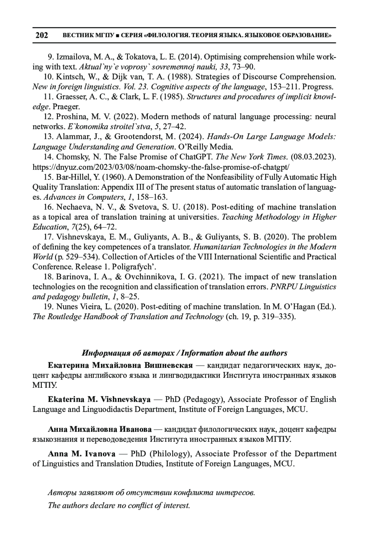 18. Баринова, И. А., & Овчинникова, И. Г. (2021). Влияние новых переводческих технологий на распознавание и классификацию ошибок перевода. Вестник Пермского национального исследовательского политехнического университета. Проблемы языкознания и педагогики, 1, 8-25.