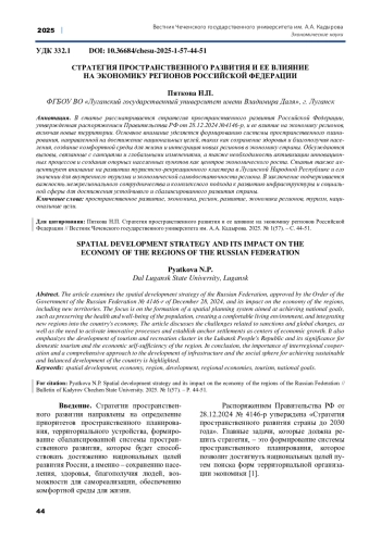 В статье рассматривается стратегия пространственного развития Российской Федерации, утвержденная распоряжением Правительства РФ от 28.12.2024 №4146-р, и ее влияние на экономику регионов, включая новые территории. Основное внимание уделяется формированию системы пространственного планирования, направленной на достижение национальных целей, таких как сохранение здоровья и благополучия населения, создание комфортной среды для жизни и интеграция новых регионов в экономику страны. Обсуждаются вызовы, связанные с санкциями и глобальными изменениями, а также необходимость активизации инновационных процессов и создания опорных населенных пунктов как центров экономического роста. Статья также акцентирует внимание на развитии туристско-рекреационного кластера в Луганской Народной Республике и его значении для внутреннего туризма и экономической самодостаточности региона. В заключение подчеркивается важность межрегионального сотрудничества и комплексного подхода к развитию инфраструктуры и социальной сферы для достижения устойчивого и сбалансированного развития страны.