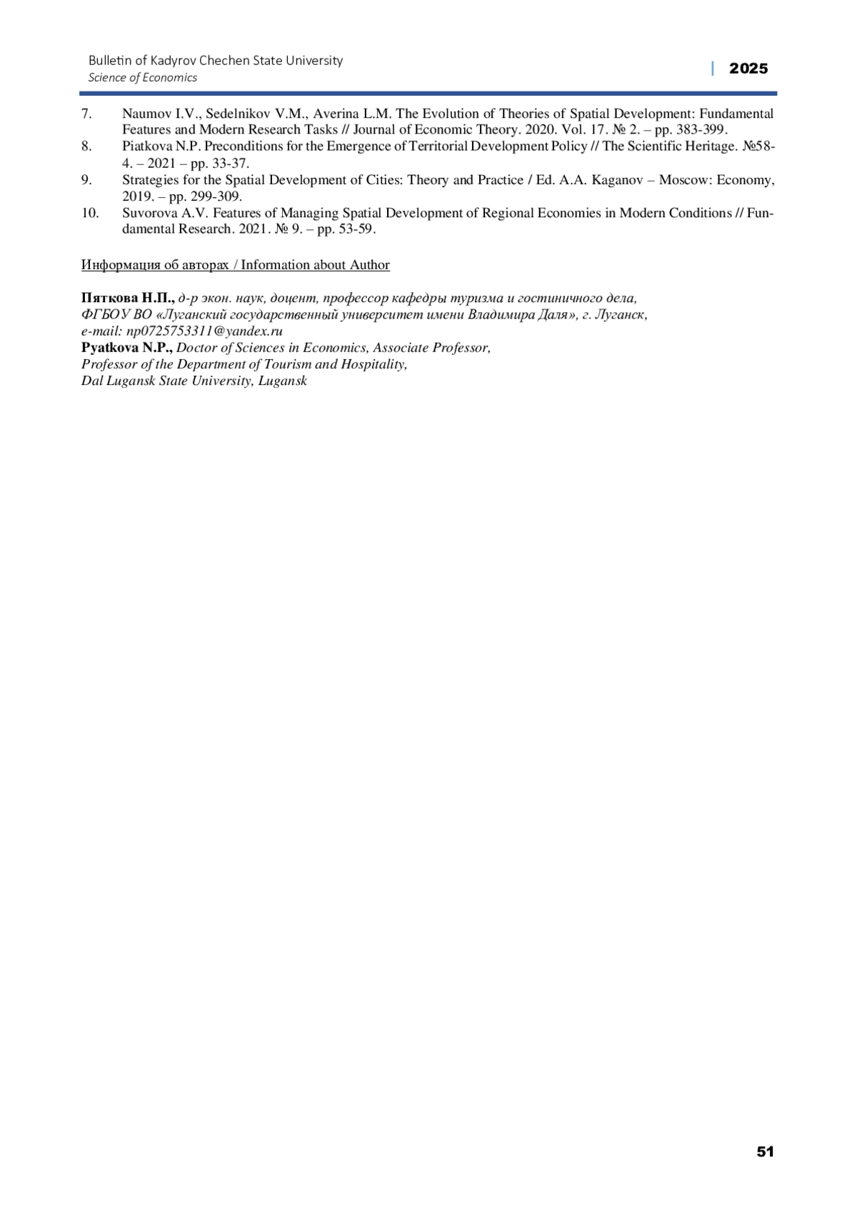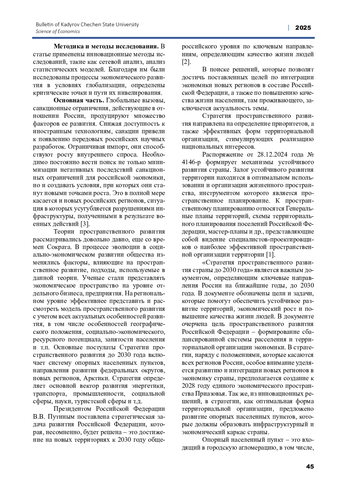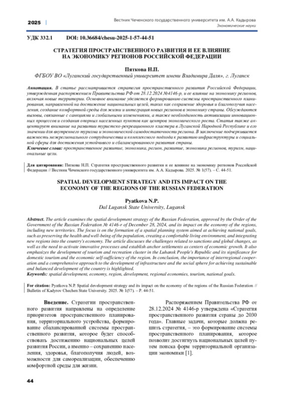 ПЯТКОВА Н.П. СТРАТЕГИЯ ПРОСТРАНСТВЕННОГО РАЗВИТИЯ И ЕЕ ВЛИЯНИЕ НА ЭКОНОМИКУ РЕГИОНОВ РОССИЙСКОЙ ФЕДЕРАЦИИ // ВЕСТНИК ЧЕЧЕНСКОГО ГОСУДАРСТВЕННОГО УНИВЕРСИТЕТА ИМ. А. А. КАДЫРОВА. 2025. № 1 (57)