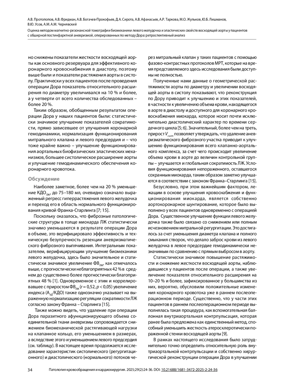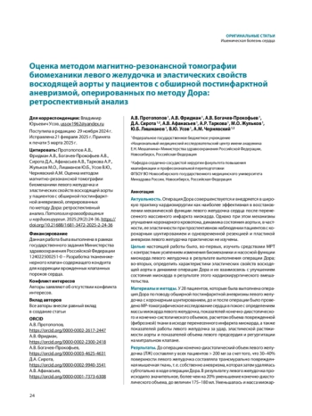 УСОВ В. Ю., ПРОТОПОПОВ А. В., ФРИДМАН А. В., БОГАЧЕВ-ПРОКОФЬЕВ А. В., СИРОТА Д.А., АФАНАСЬЕВ А. В., ТАРКОВА А.Р., ЖУЛЬКОВ М. О., ЛИШМАНОВ Ю.Б., ЧЕРНЯВСКИЙ А. М. ОЦЕНКА МЕТОДОМ МАГНИТНО-РЕЗОНАНСНОЙ ТОМОГРАФИИ БИОМЕХАНИКИ ЛЕВОГО ЖЕЛУДОЧКА И ЭЛАСТИЧЕСКИХ СВОЙСТВ ВОСХОДЯЩЕЙ АОРТЫ У ПАЦИЕНТОВ С ОБШИРНОЙ ПОСТИНФАРКТНОЙ АНЕВРИЗМОЙ, ОПЕРИРОВАННЫХ ПО МЕТОДУ ДОРА: РЕТРОСПЕКТИВНЫЙ АНАЛИЗ // ПАТОЛОГИЯ КРОВООБРАЩЕНИЯ И КАРДИОХИРУРГИЯ. 2025. № 2, ТОМ 29