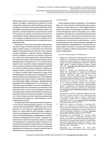 Результаты. До операции конечно-диастолический объем левого желудочка (ЛЖ) составлял у всех пациентов > 200 мл за счет того, что 30–40% поверхности левого желудочка составляла трансмурально поврежденная мышечная ткань, т. е. собственно аневризма, которая затем удалялась субтотально в ходе операции Дора. В результате у левого желудочка происходило значительное, более чем на 20% уменьшение конечно-диастолического объема, до величин 175–180 мл. Уменьшалась и масса миокарда левого желудочка с 284 ± 17,9 до 260 ± 17,6 г благодаря резекции большей части аневризмы в ходе операции Дора. При исследовании с контрастным усилением оказалось, что доля повреждения миокарда, т. е. участки фиброза миокарда левого желудочка, статистически значимо уменьшаются в объеме, с 42 ± 7 до 33,8 ± 10 %. Интегральным показателем, верифицирующим улучшение биомеханики левого желудочка, здесь было значительное и статистически значимое увеличение фракции выброса левого желудочка, с прогностически неблагоприятных 42 % в среднем по группе до 48 %, которые ассоциируются с существенно лучшим прогнозом. Коррелировавшее с приростом фракции выброса ЛЖ (r = 0,52, p < 0,05) увеличение индекса отношения работы ЛЖ за удар к конечно-диастолическому объему (Ауд/КДО) также однозначно указывает на выраженную нормализацию регуляции сократимости миокарда левого желудочка по Франку‑Старлингу. Диаметр кольца митрального клапана в результате операции Дора статистически значимо уменьшался (имплантация специализированных протезирующих митральных колец при этом не проводилась) с 31 ± 3,2 до 25 ± 2,8 мм (p < 0,05), а вследствие этого улучшались (снижались) и величины объема левого предсердия с 83,6 ± 23,9 до 68,1 ± 15,1 мл (p < 0,05). Также улучшалась систолическая растяжимость аорты при оценке ее как увеличения объема восходящей аорты в систолу – с 14,9 ± 5,56 до 21,1 ± 4,1 мл (p < 0,05).