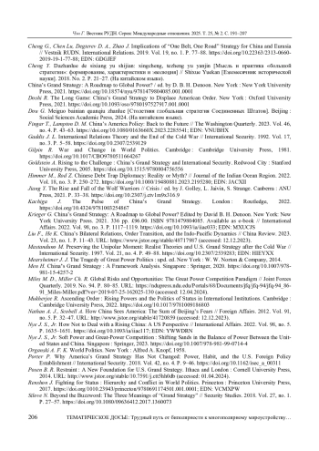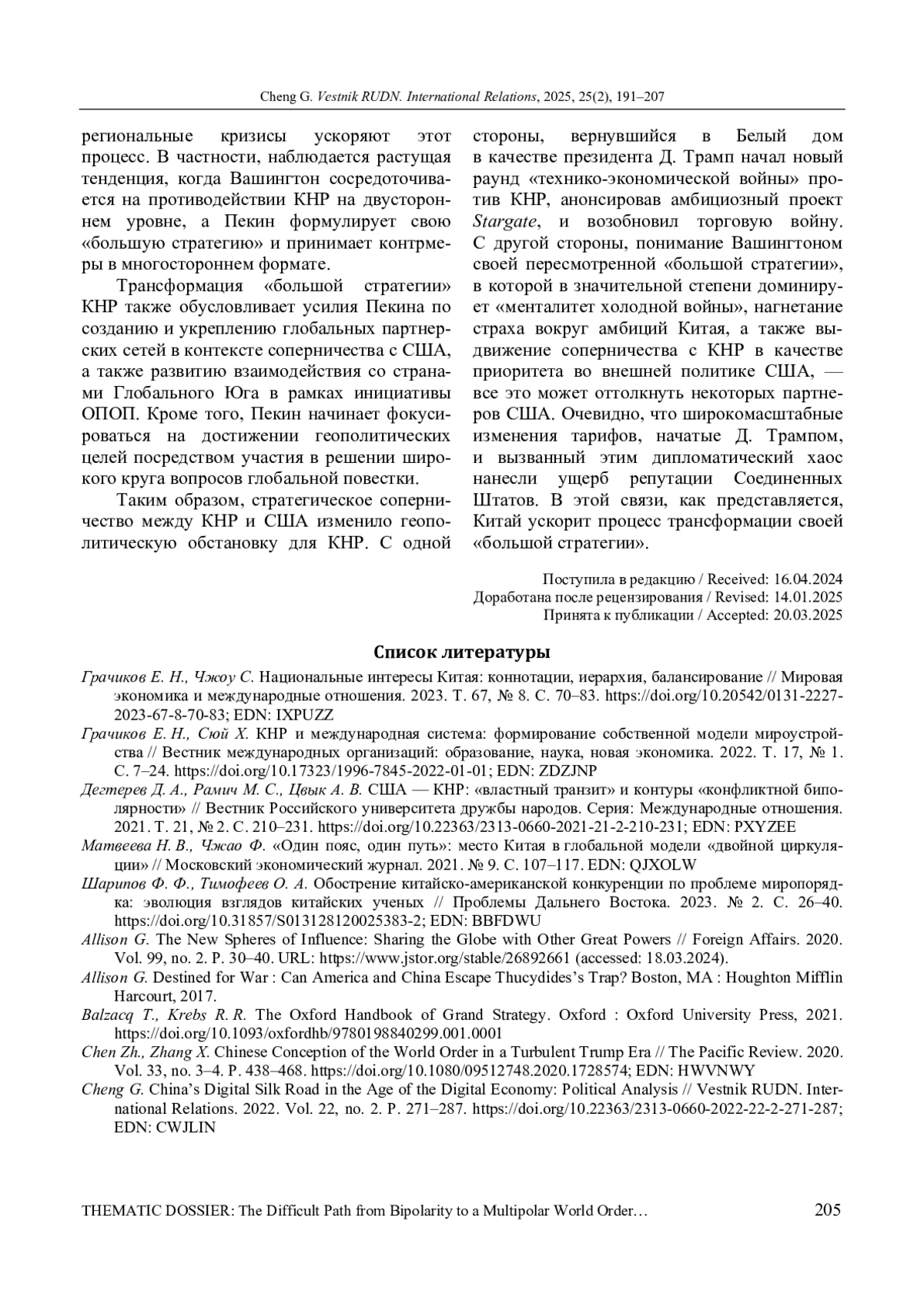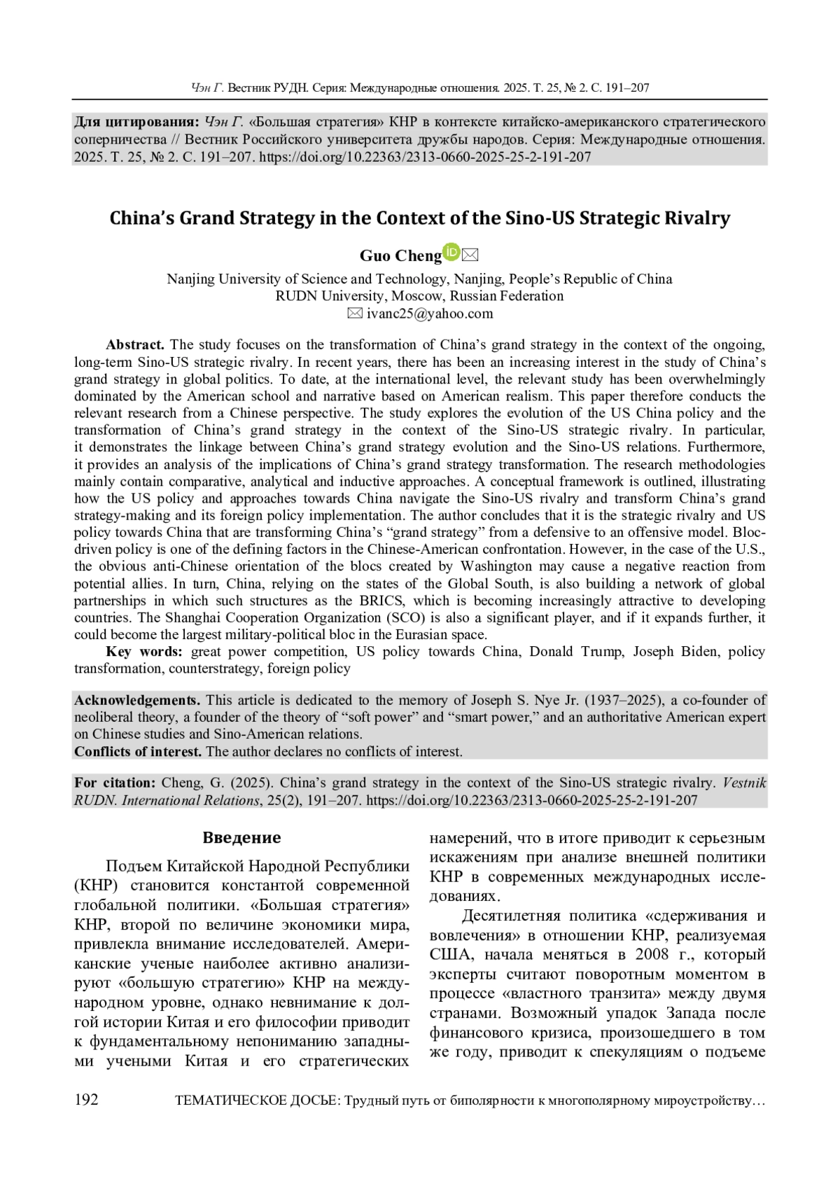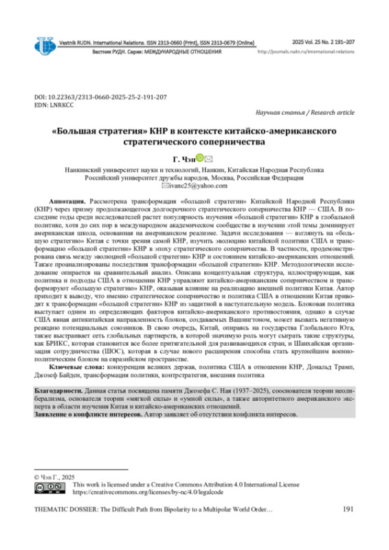 ЧЭН Г. Г. «БОЛЬШАЯ СТРАТЕГИЯ» КНР В КОНТЕКСТЕ КИТАЙСКО-АМЕРИКАНСКОГО СТРАТЕГИЧЕСКОГО СОПЕРНИЧЕСТВА // ВЕСТНИК РОССИЙСКОГО УНИВЕРСИТЕТА ДРУЖБЫ НАРОДОВ. СЕРИЯ: МЕЖДУНАРОДНЫЕ ОТНОШЕНИЯ. 2025. ТОМ 25 № 2