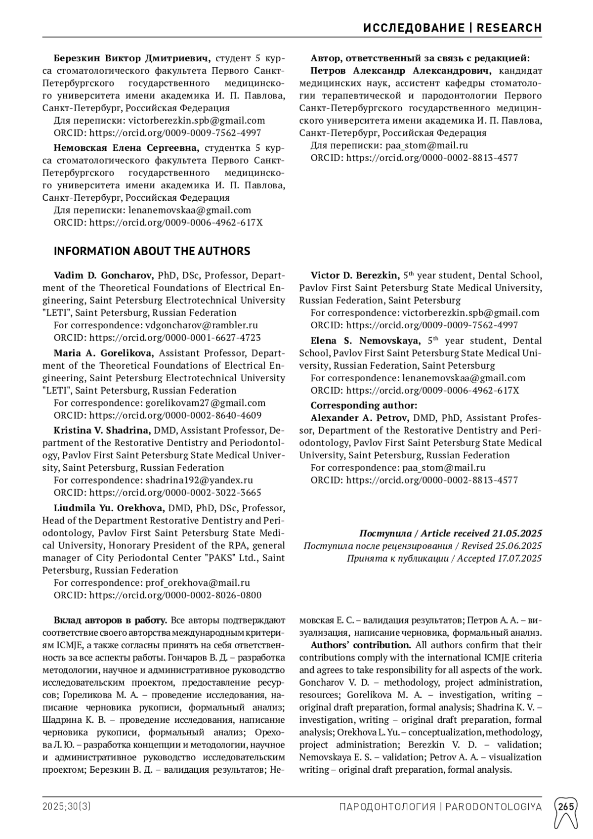 27. Gorelikova MA, Zharikova V, Kuznetsova TA. Study of Impedance Frequency Dependences of Healthy and Depulpated Teeth. 2023 Seminar on Digital Medical and Environmental Systems and Tools (DMEST) (2023):35-38. DOI: 10.1109/DMEST60476.2023.10339623