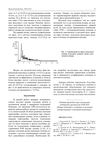 В данной работе впервые экспериментально получен режим усиления шумов в плазменном мазере с инверсной геометрией. Показано, что введение СВЧ-поглотителя переводит режим работы мазера из генераторного в усилительный. В обоих режимах показана перестройка частоты излучения при изменении концентрации плазмы. Если в режиме генерации перестройка частоты однозначно определяется изменением плотности плазмы, как это было показано в других подобных работах по плазменным генераторам с распространением РЭП внутри плазмы [3–6], то в режиме усиления шума изменение спектра излучения с ростом концентрации плазмы требует дальнейшего изучения. Необходимо более подробно исследовать как спектр шума при разных значениях параметров установки, так и зависимость коэффициента усиления от плотности плазмы. Авторы работы выражают благодарность С. В. Гарнову за поддержку работы и предоставление оборудования, без которого проведение эксперимента было бы невозможно. Авторы также благодарны П. С. Стрелкову за многочисленные полезные обсуждения.