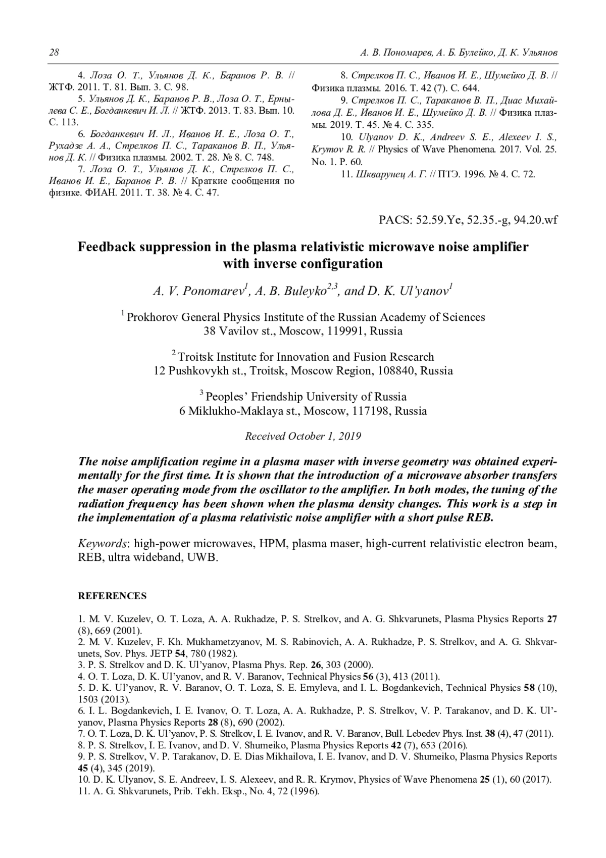 6. Богданкевич И. Л., Иванов И. Е., Лоза О. Т., Рухадзе А. А., Стрелков П. С., Тараканов В. П., Ульянов Д. К. // Физика плазмы. 2002. Т. 28. № 8. С. 748.
