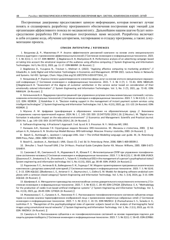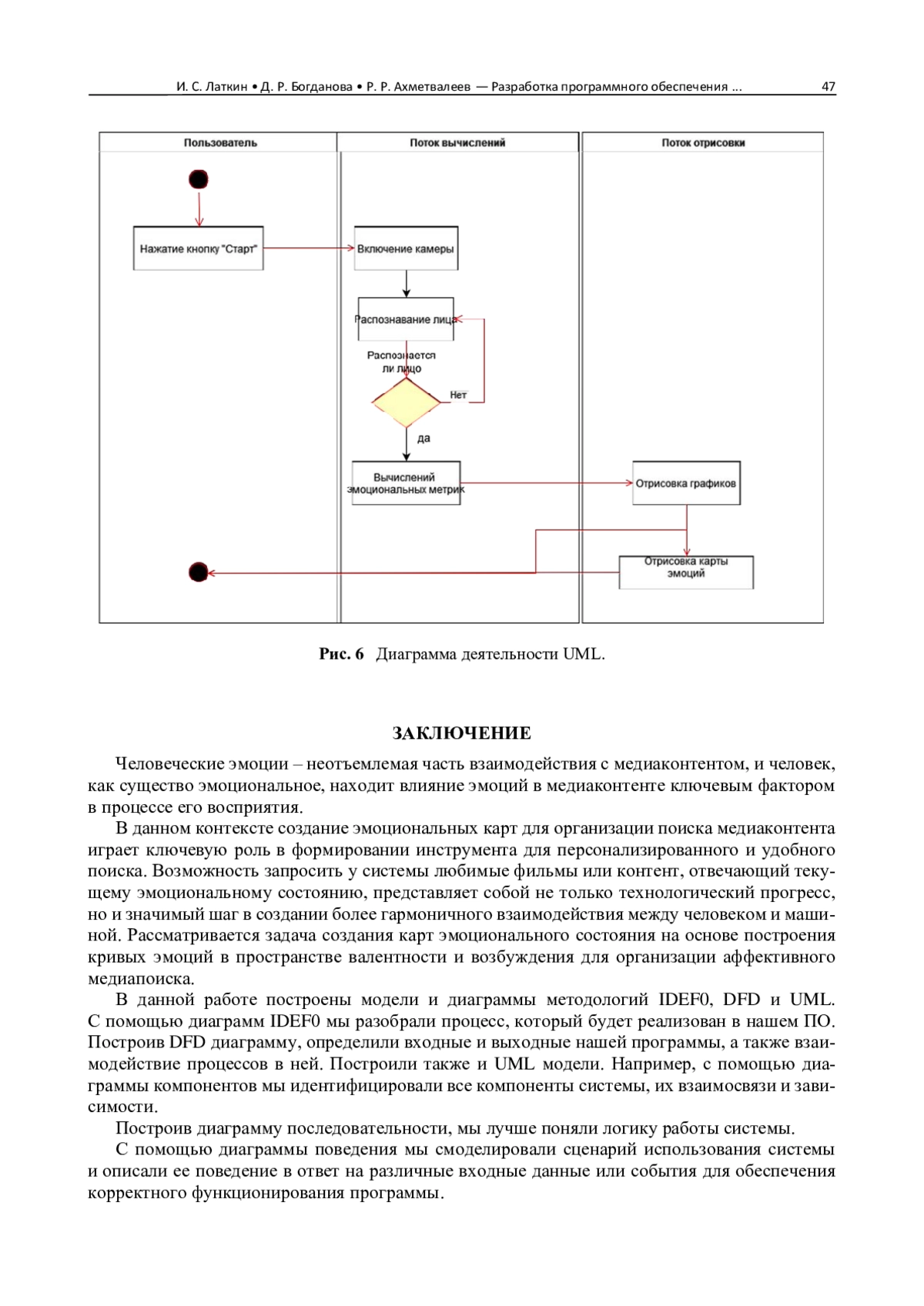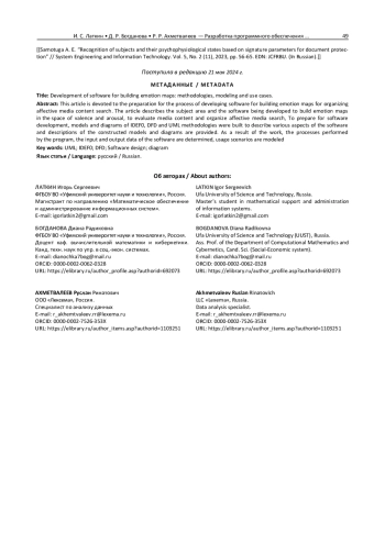 ЛАТКИН И. С., БОГДАНОВА Д. Р., АХМЕТВАЛЕЕВ Р. Р. РАЗРАБОТКА ПРОГРАММНОГО ОБЕСПЕЧЕНИЯ ДЛЯ ПОСТРОЕНИЯ КАРТ ЭМОЦИЙ: МЕТОДОЛОГИИ МОДЕЛИРОВАНИЯ И СЦЕНАРИИ ИСПОЛЬЗОВАНИЯ // СИСТЕМНАЯ ИНЖЕНЕРИЯ И ИНФОРМАЦИОННЫЕ ТЕХНОЛОГИИ. 2024. ТОМ 6, № 2(17)