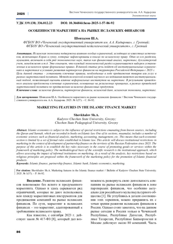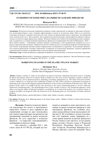 ШОВХАЛОВ Ш. А. ОСОБЕННОСТИ МАРКЕТИНГА НА РЫНКЕ ИСЛАМСКИХ ФИНАНСОВ // ВЕСТНИК ЧЕЧЕНСКОГО ГОСУДАРСТВЕННОГО УНИВЕРСИТЕТА ИМ. А. А. КАДЫРОВА. 2025. № 1 (57)