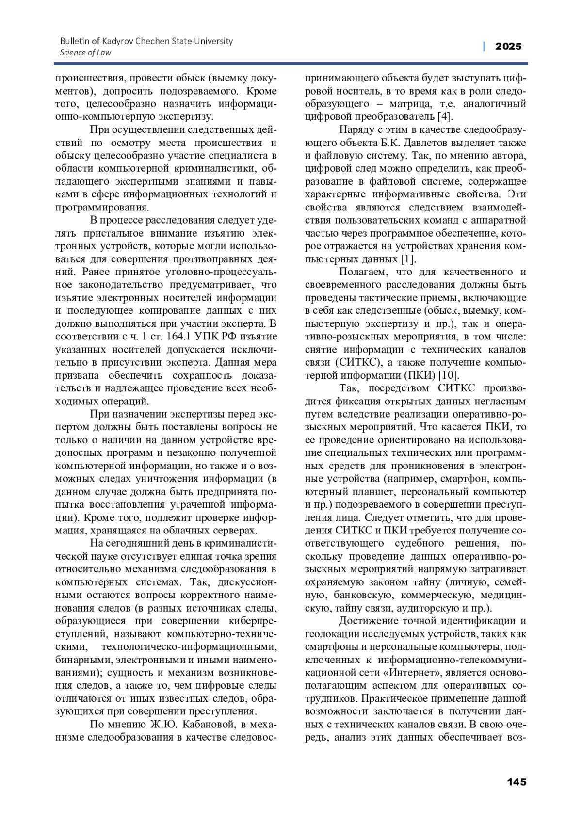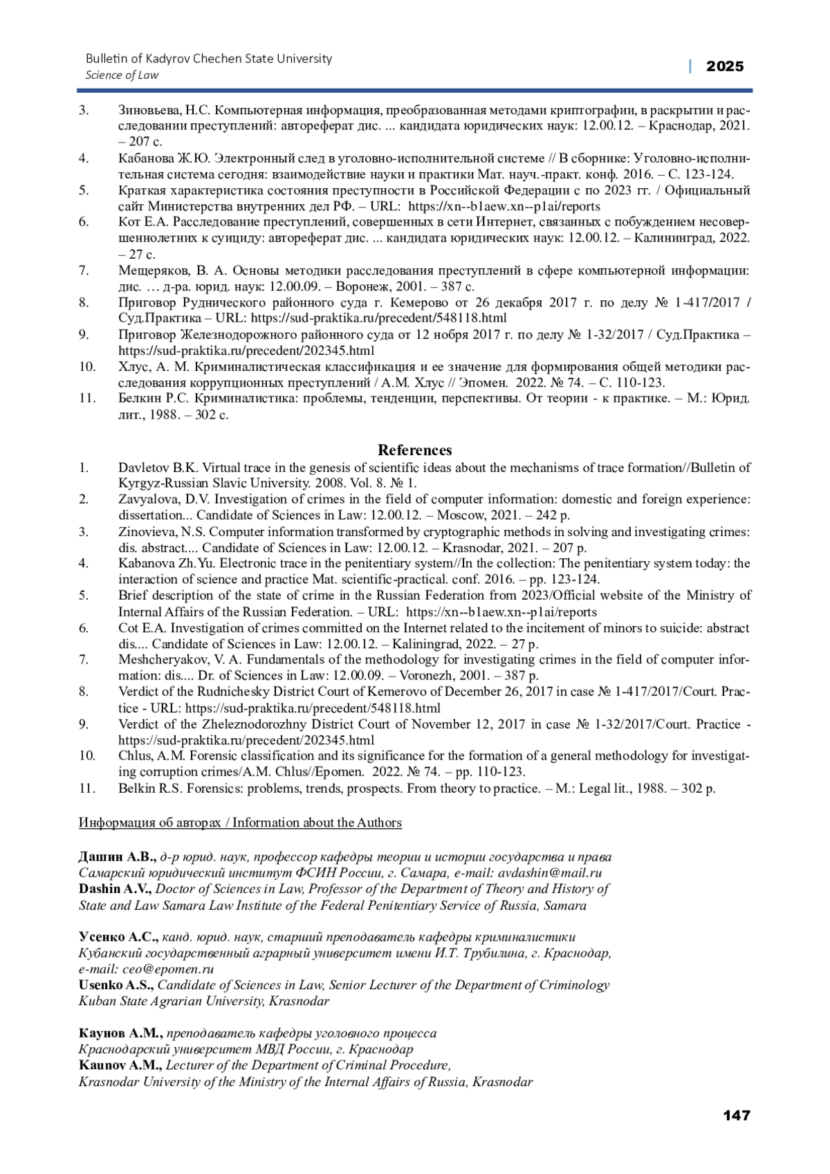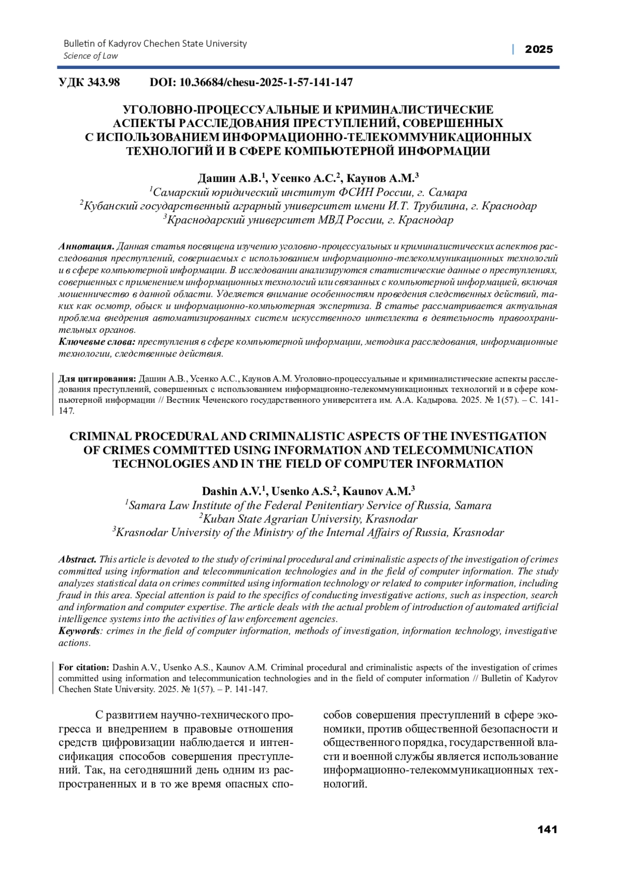 ДАШИН А. В., УСЕНКО А. С., КАУНОВ А. М. УГОЛОВНО-ПРОЦЕССУАЛЬНЫЕ И КРИМИНАЛИСТИЧЕСКИЕ АСПЕКТЫ РАССЛЕДОВАНИЯ ПРЕСТУПЛЕНИЙ, СОВЕРШЕННЫХ С ИСПОЛЬЗОВАНИЕМ ИНФОРМАЦИОННО-ТЕЛЕКОММУНИКАЦИОННЫХ ТЕХНОЛОГИЙ И В СФЕРЕ КОМПЬЮТЕРНОЙ ИНФОРМАЦИИ // ВЕСТНИК ЧЕЧЕНСКОГО ГОСУДАРСТВЕННОГО УНИВЕРСИТЕТА ИМ. А. А. КАДЫРОВА. 2025. № 1 (57)