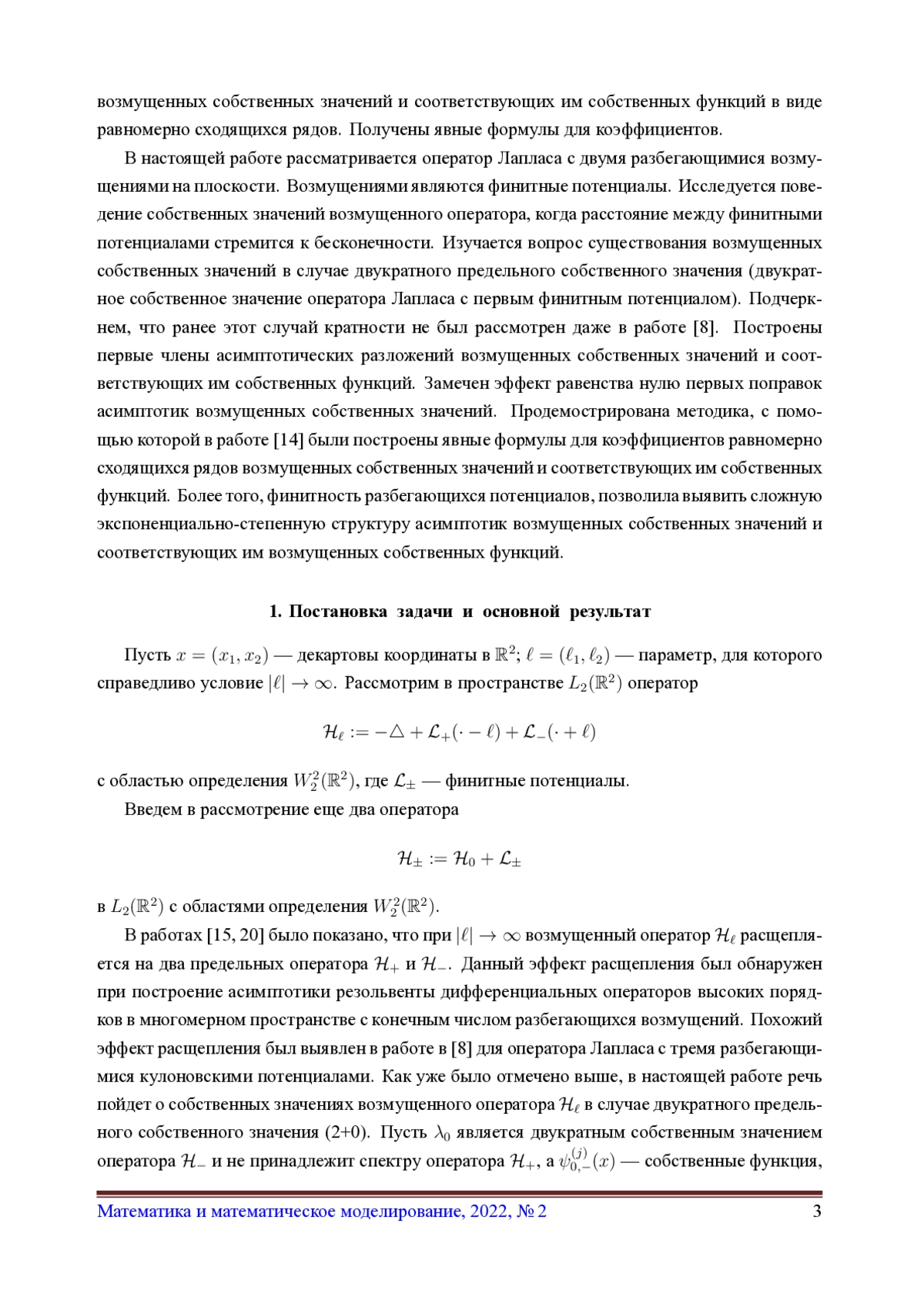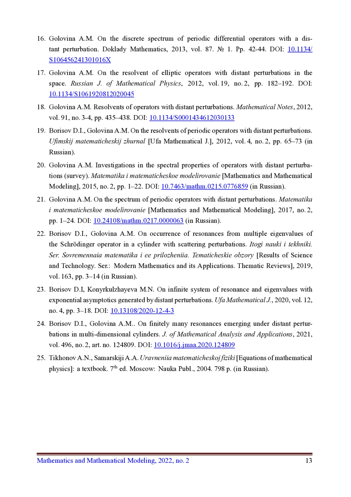 24. Borisov D.I., Golovina A.M. On finitely many resonances emerging under distant perturbations in multi-dimensional cylinders //j. of Mathematical Analysis and Applications. 2021. Vol. 496. No. 2. Art. no. 124809. DOI: 10.1016/j.jmaa.2020.124809 EDN: KIYSML