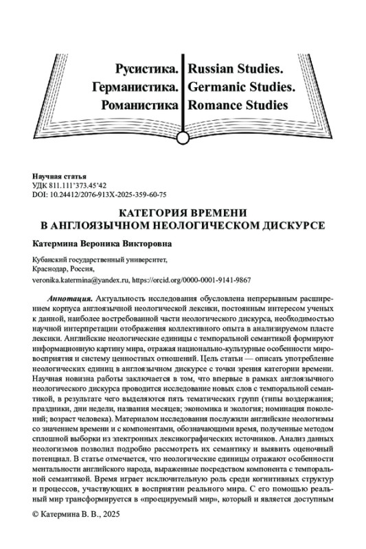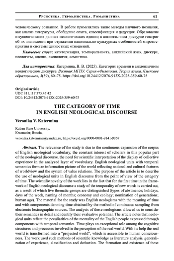 Актуальность исследования обусловлена непрерывным расширением корпуса англоязычной неологической лексики, постоянным интересом ученых к данной, наиболее востребованной части неологического дискурса, необходимостью научной интерпретации отображения коллективного опыта в анализируемом пласте лексики. Английские неологические единицы с темпоральной семантикой формируют информационную картину мира, отражая национально-культурные особенности мировосприятия и систему ценностных отношений. Цель статьи - описать употребление неологических единиц в англоязычном дискурсе с точки зрения категории времени. Научная новизна работы заключается в том, что впервые в рамках англоязычного неологического дискурса проводится исследование новых слов с темпоральной семантикой, в результате чего выделяются пять тематических групп (типы воздержания; праздники, дни недели, названия месяцев; экономика и экология; номинация поколений; возраст человека). Материалом исследования послужили английские неологизмы со значением времени и с компонентами, обозначающими время, полученные методом сплошной выборки из электронных лексикографических источников. Анализ данных неологизмов позволил подробно рассмотреть их семантику и выявить оценочный потенциал. В статье отмечается, что неологические единицы отражают особенности ментальности английского народа, выраженные посредством компонента с темпоральной семантикой. Время играет исключительную роль среди когнитивных структур и процессов, участвующих в восприятии реального мира. С его помощью реальный мир трансформируется в «проецируемый мир», который и является доступным человеческому сознанию. В работе применялись такие методы научного познания, как анализ литературы, обобщение опыта, классификация и дедукция. Образование и существование данных неологических единиц в англоязычном дискурсе говорит об их значимости при отражении национально-культурных особенностей мировосприятия и системы ценностных отношений.