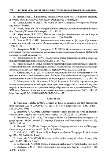 4. Бронник, Л. В. (2020). Категория пространства в языке и науке о языке. Гуманитарные и социальные науки, (5), 2-13. EDN: JQIEUL