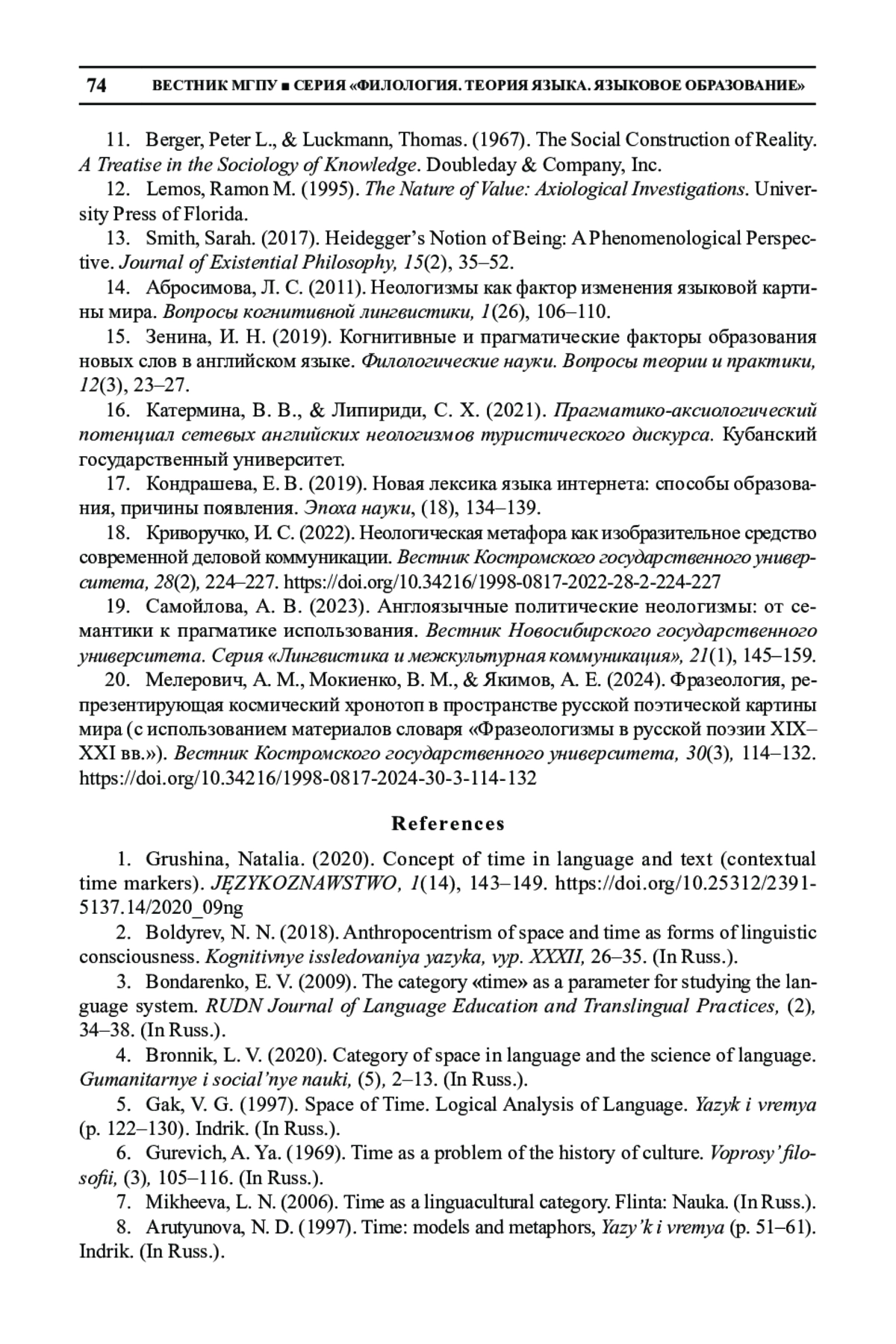 2. Болдырев, Н. Н. (2018). Антропоцентризм пространства и времени как форм языкового сознания. Когнитивные исследования языка, вып. XXXII, 26-35. EDN: XOTAGD