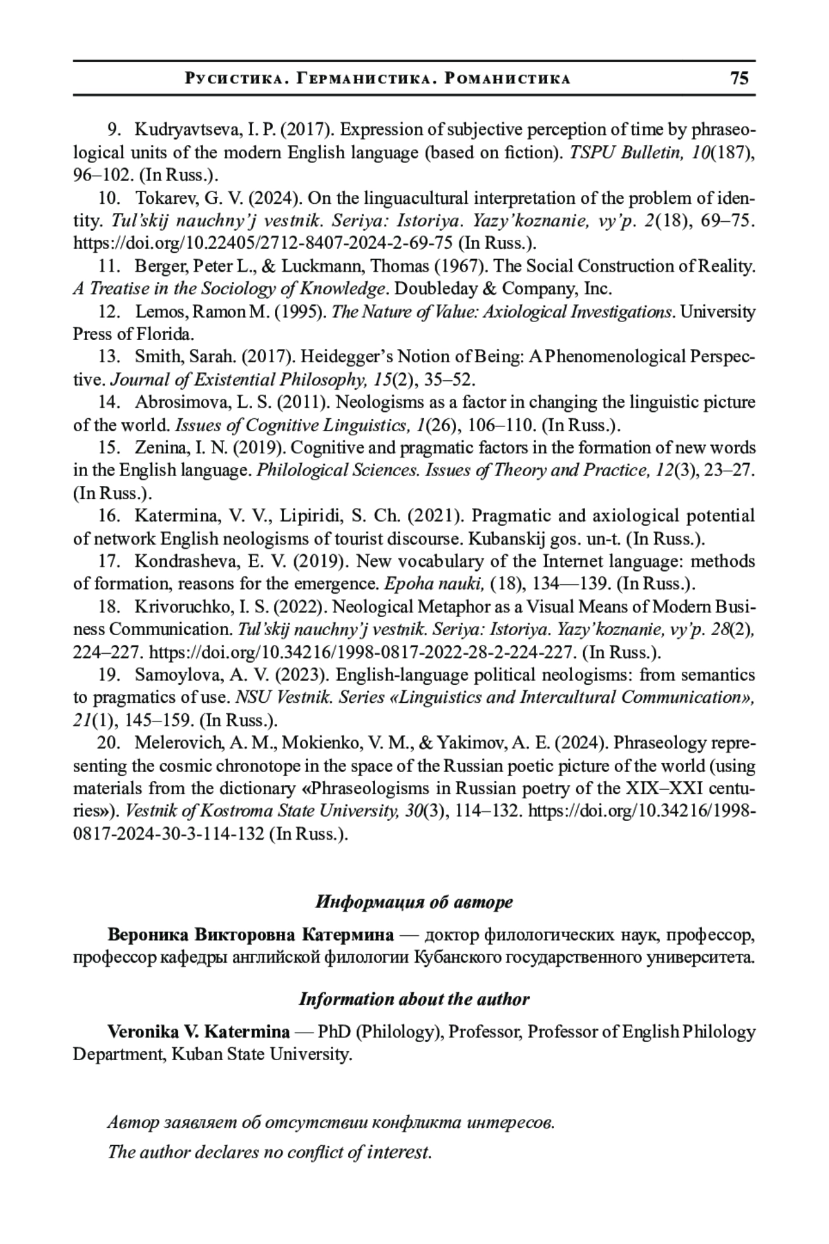 9. Кудрявцева, И. П. (2017). Выражение субъективного восприятия времени фразеологическими единицами современного английского языка (на материале художественной литературы). Вестник ТГПУ, 10(187), 96-102.
