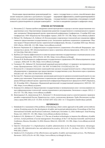 1. Москалюк Д. С. Оценка проблем внедрения клиентоцентричного подхода в системе предоставления государственных услуг. Перспективные направления развития государственного и муниципального управления: материалы I Международной научно-практической конференции, Симферополь, 12 ноября 2024 года. Симферополь: ООО «Издательство Типография «Ариал»; 2024:133-135. URL: https://www.elibrary.ru/jbutwe
