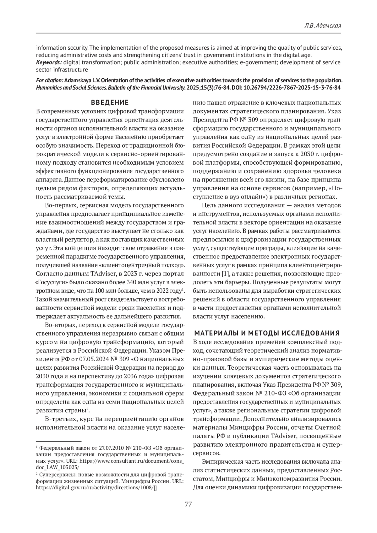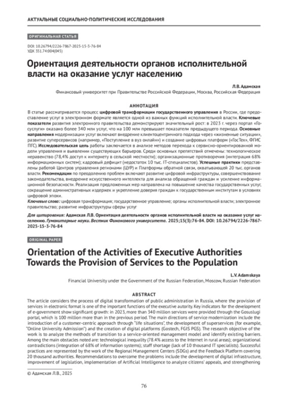 В статье рассматривается процесс цифровой трансформации государственного управления в России, где предоставление услуг в электронном формате является одной из важных функций исполнительной власти. Ключевые показатели развития электронного правительства демонстрируют значительный рост: в 2023 г. через портал «Госуслуги» оказано более 340 млн услуг, что на 100 млн превышает показатели предыдущего периода. Основные направления модернизации услуг включают внедрение клиентоцентричного подхода через «жизненные ситуации», развитие суперсервисов (например, «Поступление в вуз онлайн») и создание цифровых платформ («ГосТех», ФГИС ПГС). Исследовательская цель работы заключается в анализе методов перехода к сервисно-ориентированной модели управления и выявлении существующих барьеров. Среди основных препятствий отмечены: технологическое неравенство (78,4% доступ к интернету в сельской местности); организационные противоречия (интеграция 68% информационных систем); кадровый дефицит (недостаток 10 тыс. IT-специалистов). Успешные практики представлены работой Центров управления регионами (ЦУР) и Платформы обратной связи, охватывающей 20 тыс. органов власти. Рекомендации по преодолению проблем включают развитие цифровой инфраструктуры, совершенствование законодательства, внедрение искусственного интеллекта для анализа обращений граждан и усиление информационной безопасности. Реализация предложенных мер направлена на повышение качества государственных услуг, сокращение административных издержек и укрепление доверия граждан к государственным институтам в условиях цифровой эпохи.