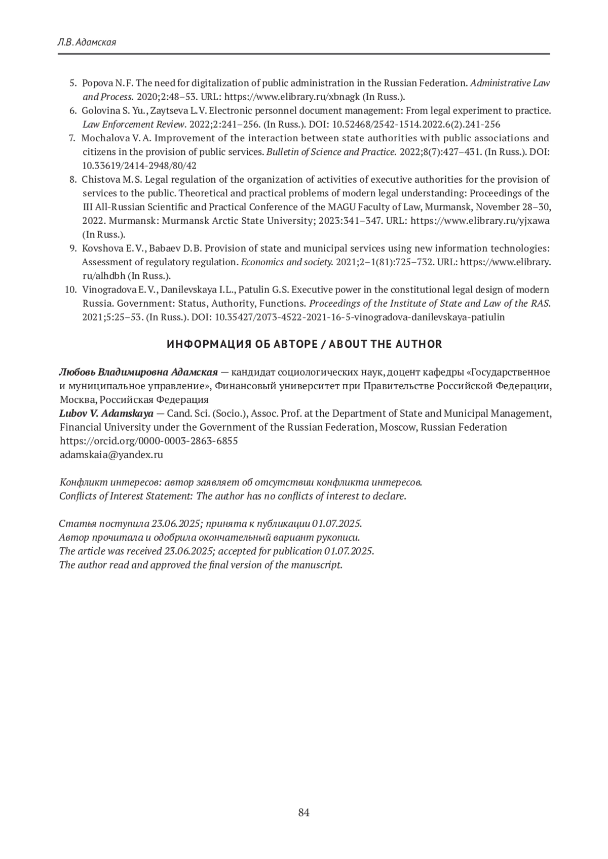 2. Рябова Г. М., Рыбакова А. В., Койнов А. В. Использование современных технологий для повышения эффективности предоставления государственных услуг. Актуальные проблемы социального управления: Сборник трудов V Всероссийской научно-практической конференции, Москва, 12 декабря 2024 года. Москва: ООО «Ритм», 2024:108-112. URL: https://www.elibrary.ru/ntvsfj