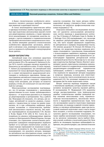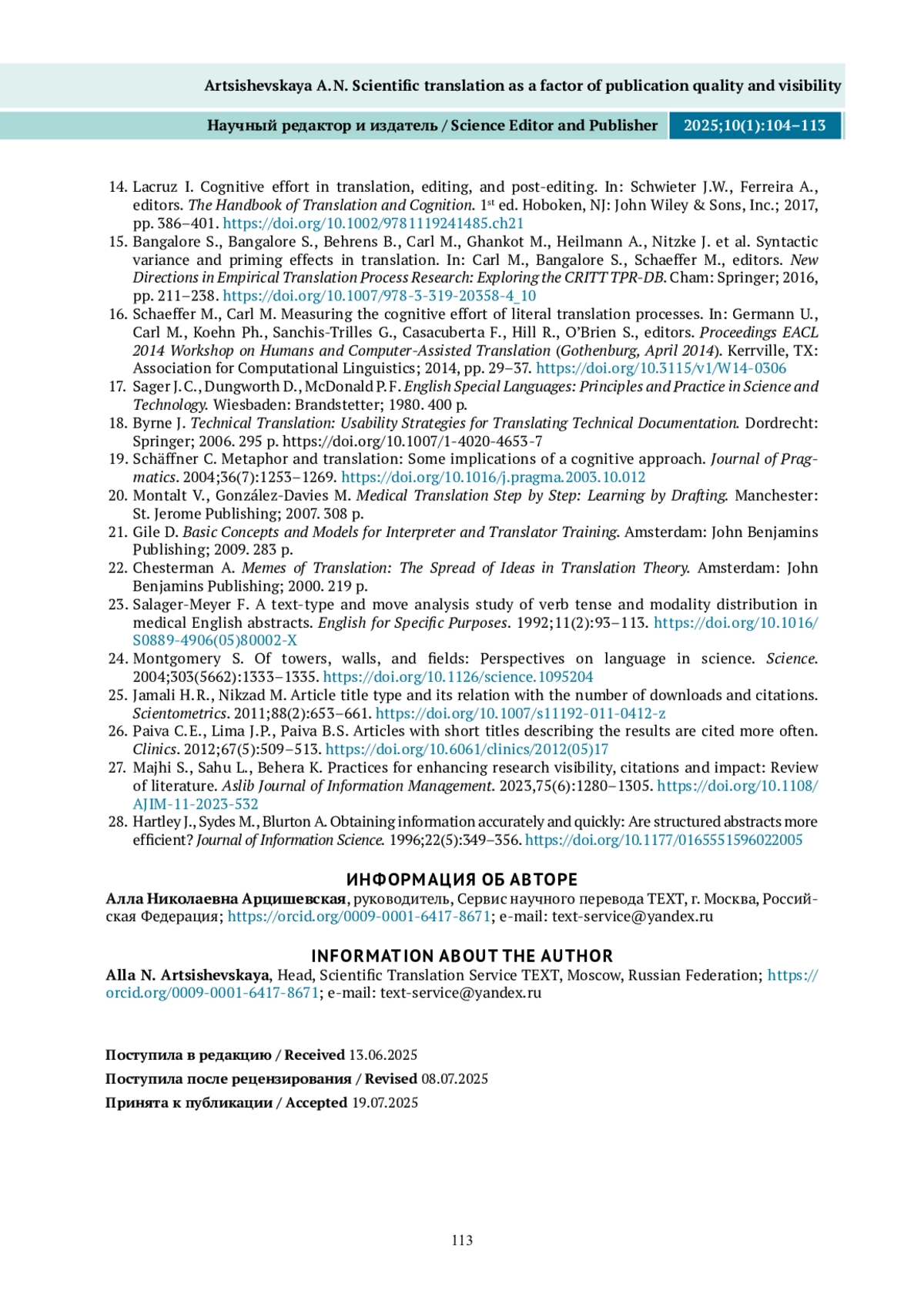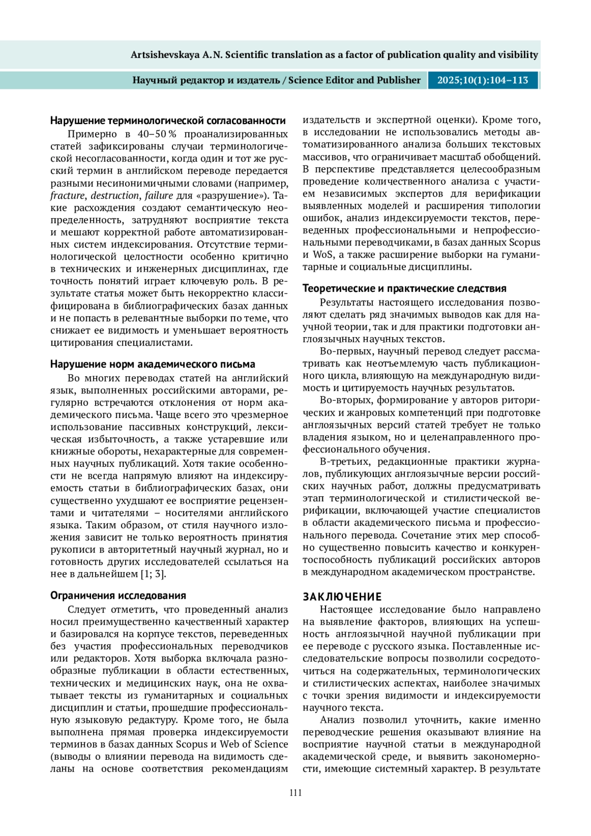 АРЦИШЕВСКАЯ А. Н. РОЛЬ НАУЧНОГО ПЕРЕВОДА В ОБЕСПЕЧЕНИИ КАЧЕСТВА И ВИДИМОСТИ ПУБЛИКАЦИЙ // НАУЧНЫЙ РЕДАКТОР И ИЗДАТЕЛЬ. 2025. № 1, ТОМ 10