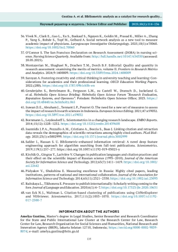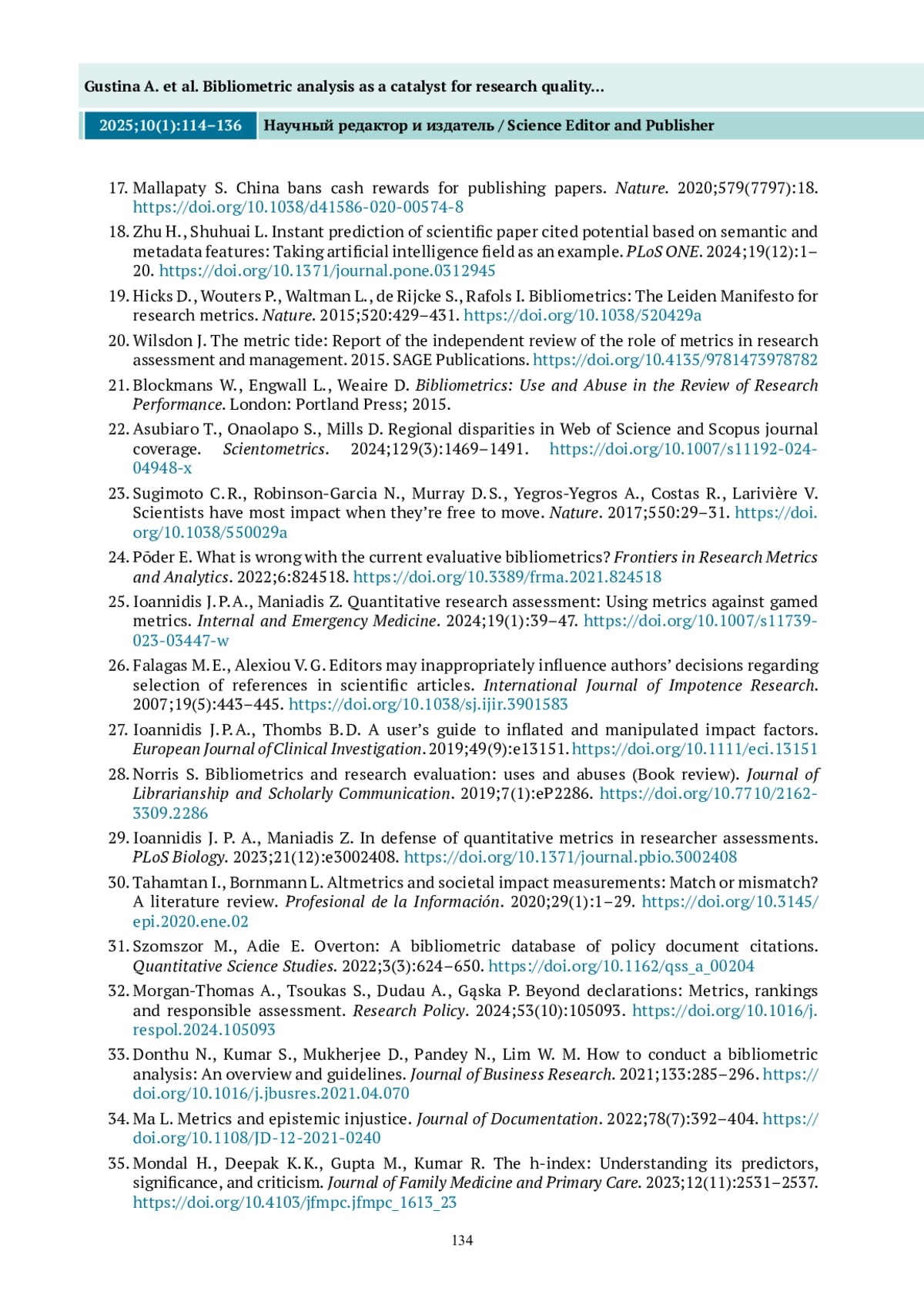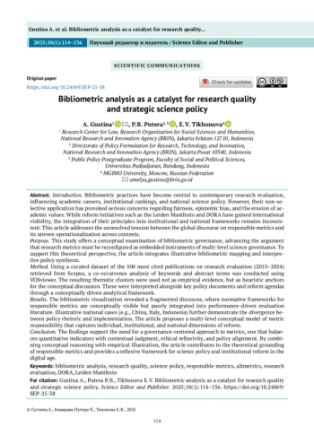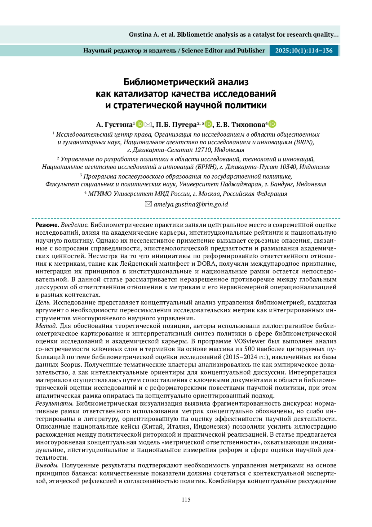 GUSTINA A., PUTERA P. B., TIKHONOVA E. V. БИБЛИОМЕТРИЧЕСКИЙ АНАЛИЗ КАК КАТАЛИЗАТОР КАЧЕСТВА ИССЛЕДОВАНИЙ И СТРАТЕГИЧЕСКОЙ НАУЧНОЙ ПОЛИТИКИ // НАУЧНЫЙ РЕДАКТОР И ИЗДАТЕЛЬ. 2025. № 1, ТОМ 10