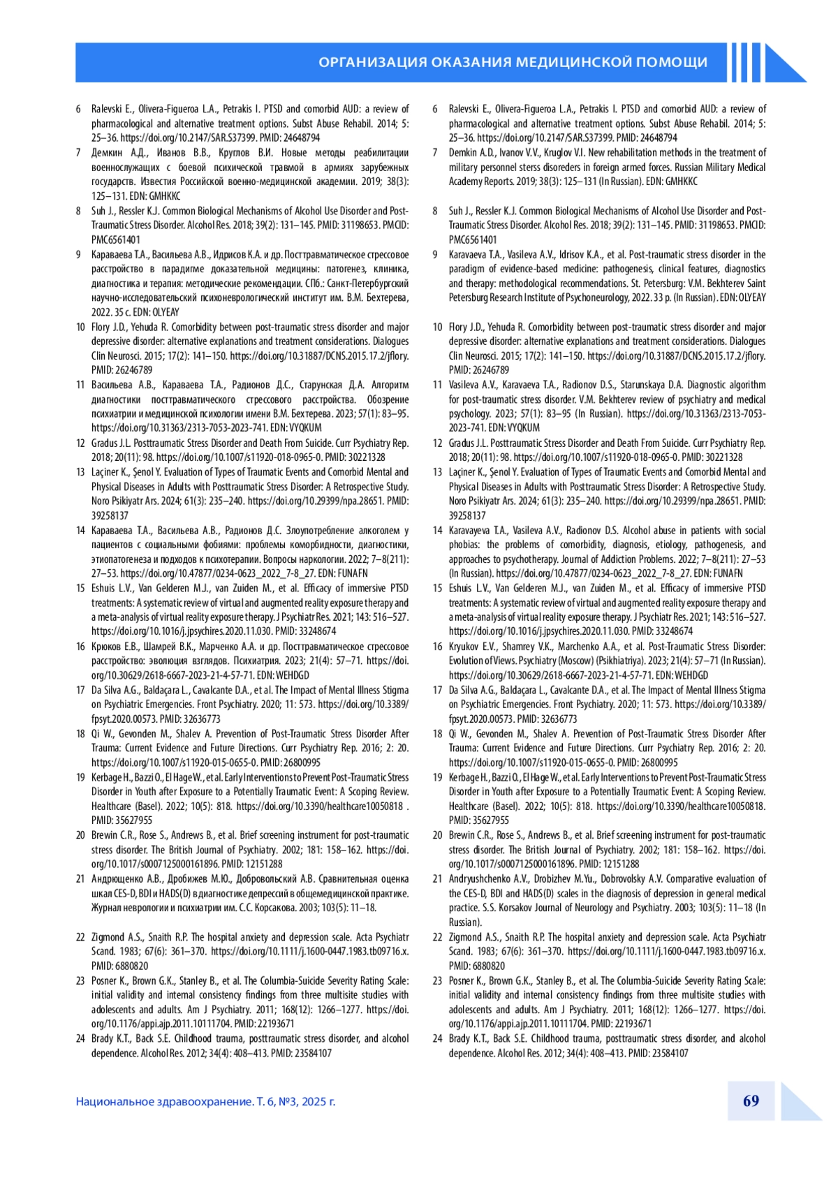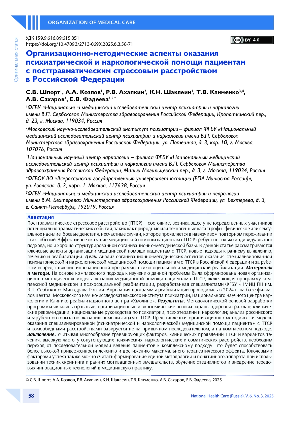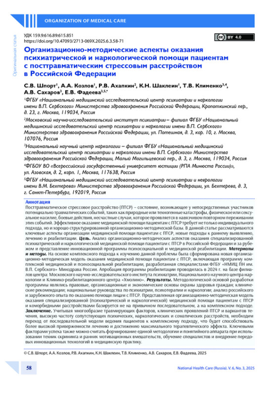 ШПОРТ С. В., КОЗЛОВ А. А., АХАПКИН Р. В., ШАКЛЕИН К. Н., КЛИМЕНКО Т. В., САХАРОВ А. В., ФАДЕЕВА Е. В. ОРГАНИЗАЦИОННО-МЕТОДИЧЕСКИЕ АСПЕКТЫ ОКАЗАНИЯ ПСИХИАТРИЧЕСКОЙ И НАРКОЛОГИЧЕСКОЙ ПОМОЩИ ПАЦИЕНТАМ С ПОСТТРАВМАТИЧЕСКИМ СТРЕССОВЫМ РАССТРОЙСТВОМ В РОССИЙСКОЙ ФЕДЕРАЦИИ // НАЦИОНАЛЬНОЕ ЗДРАВООХРАНЕНИЕ. 2025. № 3, ТОМ 6