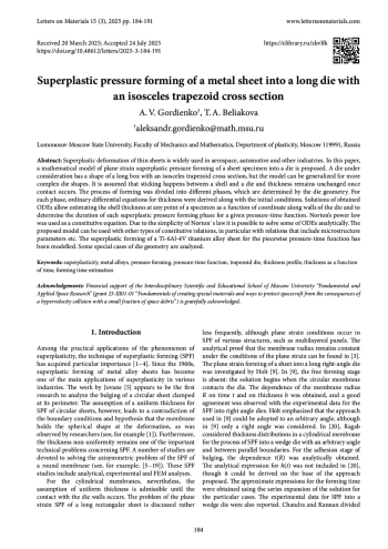 18. O. Tulupova, C. Gumerova, V. Ganieva, A. Kruglov, F. Enikeev, Improving the accuracy of finite element modeling of superplastic forming processes, Lett. Mater. 12, 2 (2022) 142 -147. DOI: 10.22226/2410-3535-2022-2-142-147
