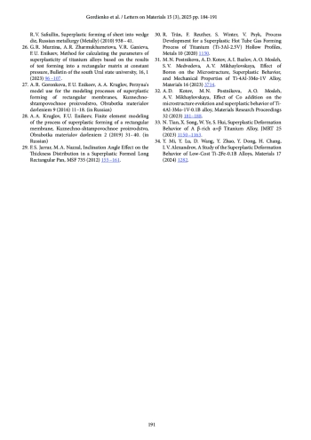 26. G. R. Murzina, A. R. Zharmukhametova, V. R. Ganieva, F. U. Enikeev, Method for calculating the parameters of superplasticity of titanium alloys based on the results of test forming into a rectangular matrix at constant pressure, Bulletin of the south Ural state university, 16, 1 (2023) 96 -107. DOI: 10.14529/mmp230108