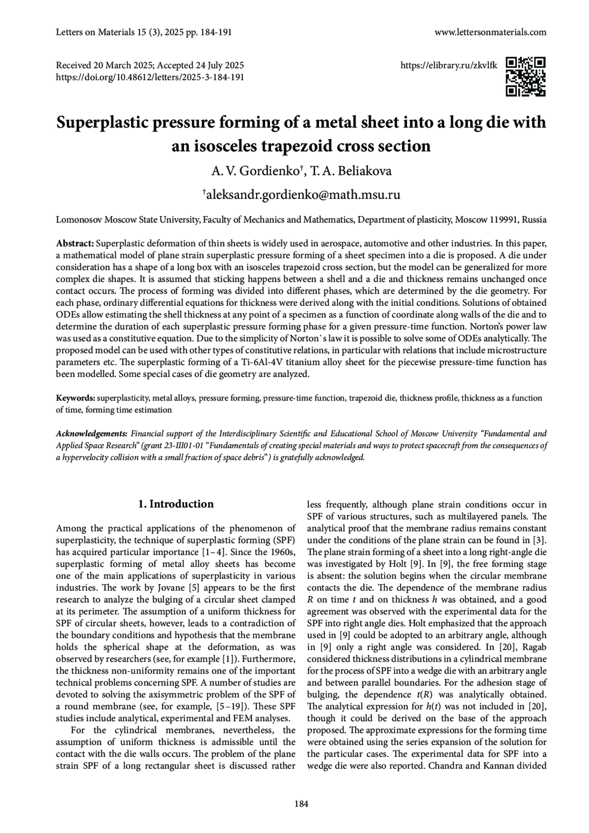 21. R. A. Vasin, F. U. Enikeev, R. V. Safiullin, Mathematical Modeling of Superplastic Forming of a Long Rectangular Box Section, Mater. Sci. Forum 304 - 306 (1999) 765 - 770. DOI: 10.4028/www.scientific.net/MSF.304-306.765