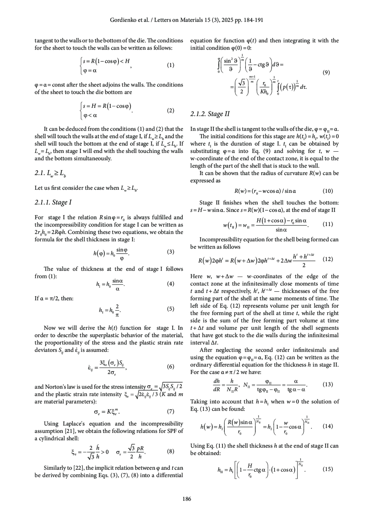 Among the practical applications of the phenomenon of superplasticity, the technique of superplastic forming (SPF) has acquired particular importance [1– 4]. Since the 1960s, superplastic forming of metal alloy sheets has become one of the main applications of superplasticity in various industries. The work by Jovane [5] appears to be the first research to analyze the bulging of a circular sheet clamped at its perimeter. The assumption of a uniform thickness for SPF of circular sheets, however, leads to a contradiction of the boundary conditions and hypothesis that the membrane holds the spherical shape at the deformation, as was observed by researchers (see, for example [1]). Furthermore, the thickness non-uniformity remains one of the important technical problems concerning SPF. A number of studies are devoted to solving the axisymmetric problem of the SPF of a round membrane (see, for example, [5 –19]). These SPF studies include analytical, experimental and FEM analyses.
