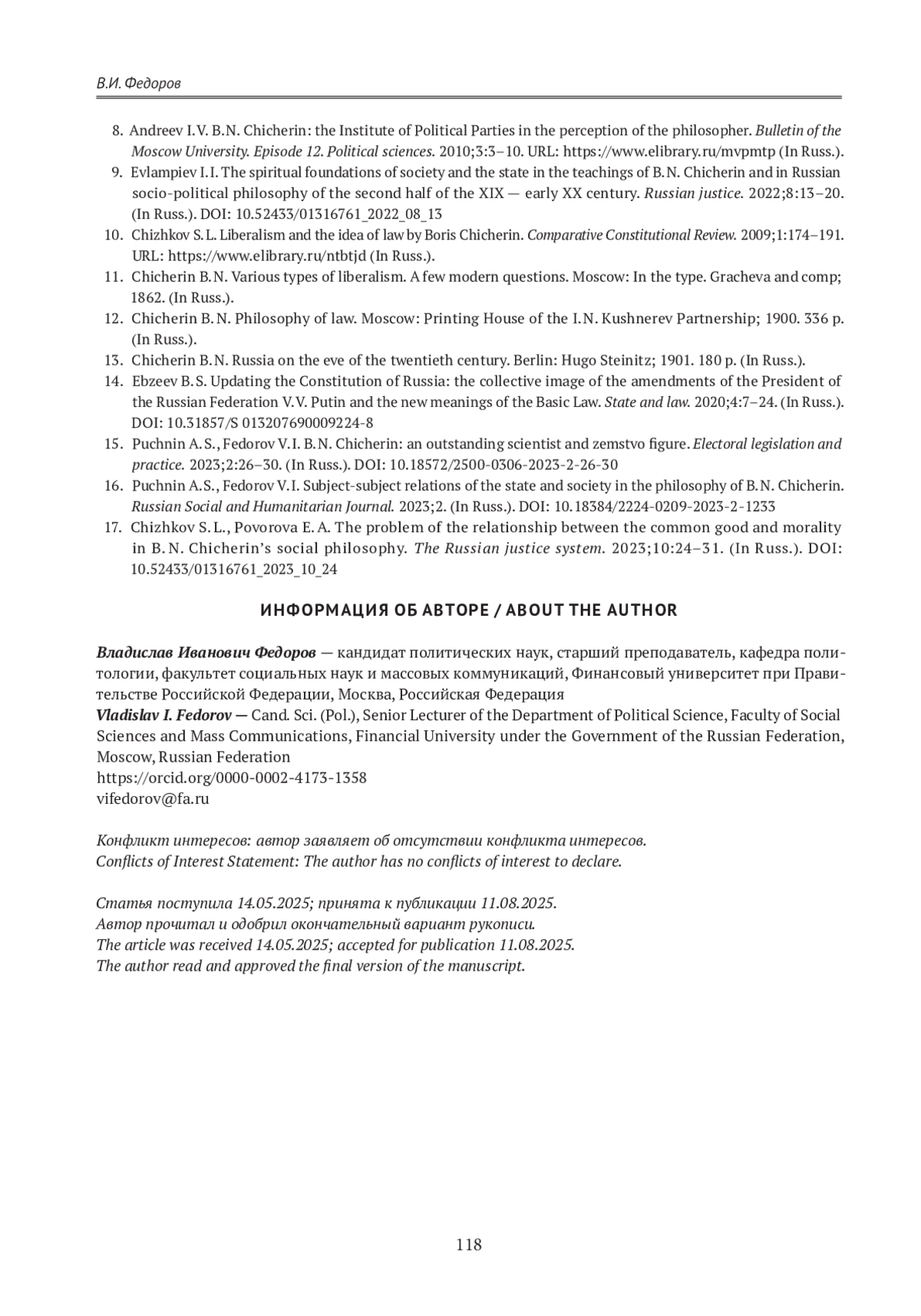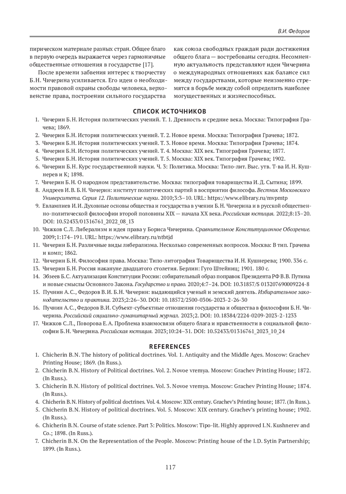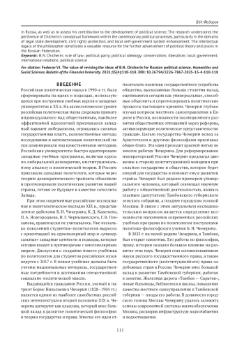 ФЕДОРОВ В. И. ЦЕННОСТЬ РЕВИЗИИ ИДЕЙ Б. Н. ЧИЧЕРИНА ДЛЯ РОССИЙСКОЙ ПОЛИТИЧЕСКОЙ НАУКИ // ГУМАНИТАРНЫЕ НАУКИ. ВЕСТНИК ФИНАНСОВОГО УНИВЕРСИТЕТА. 2025. ТОМ 15, № 4
