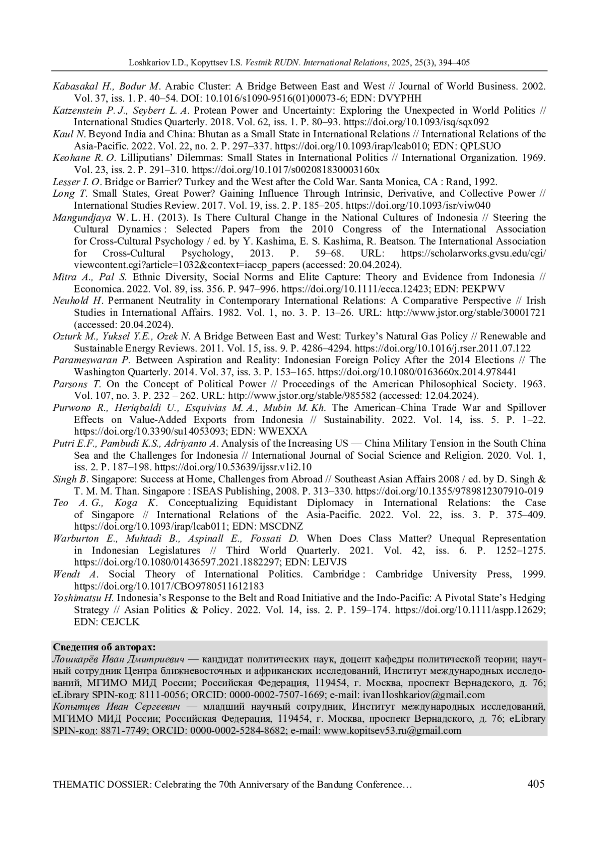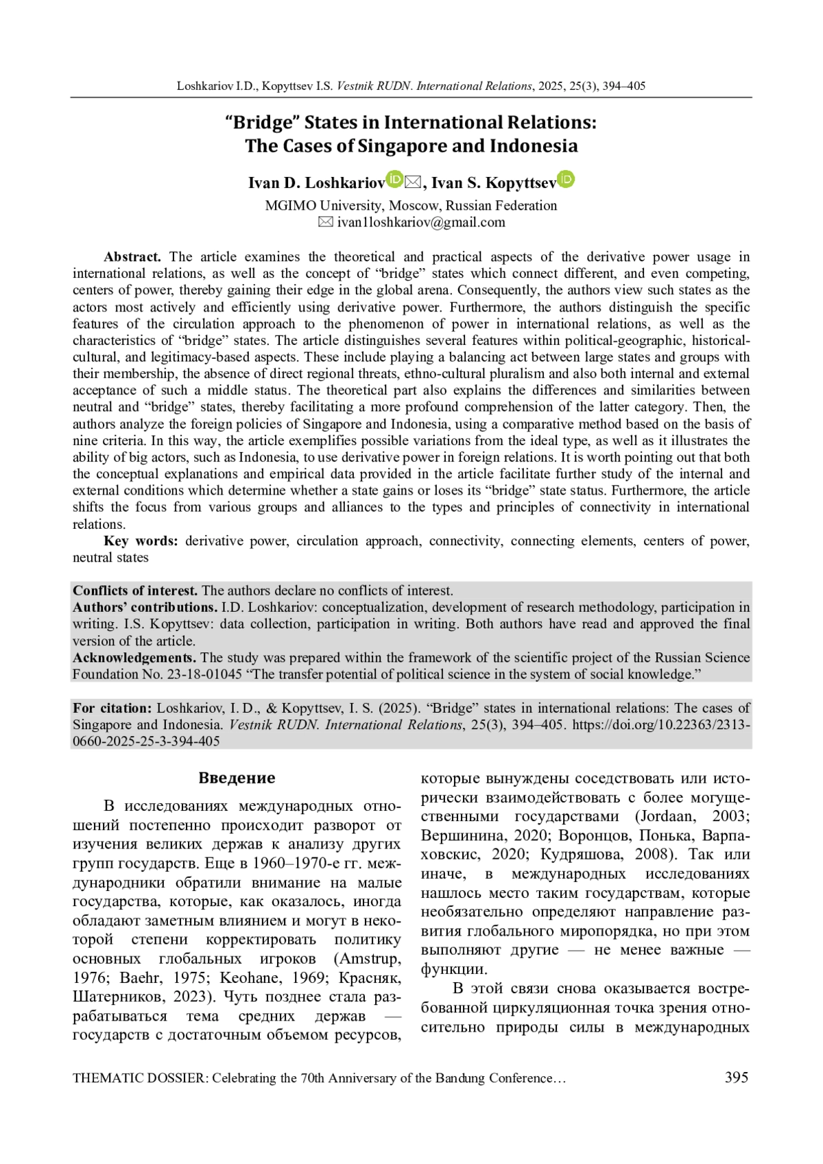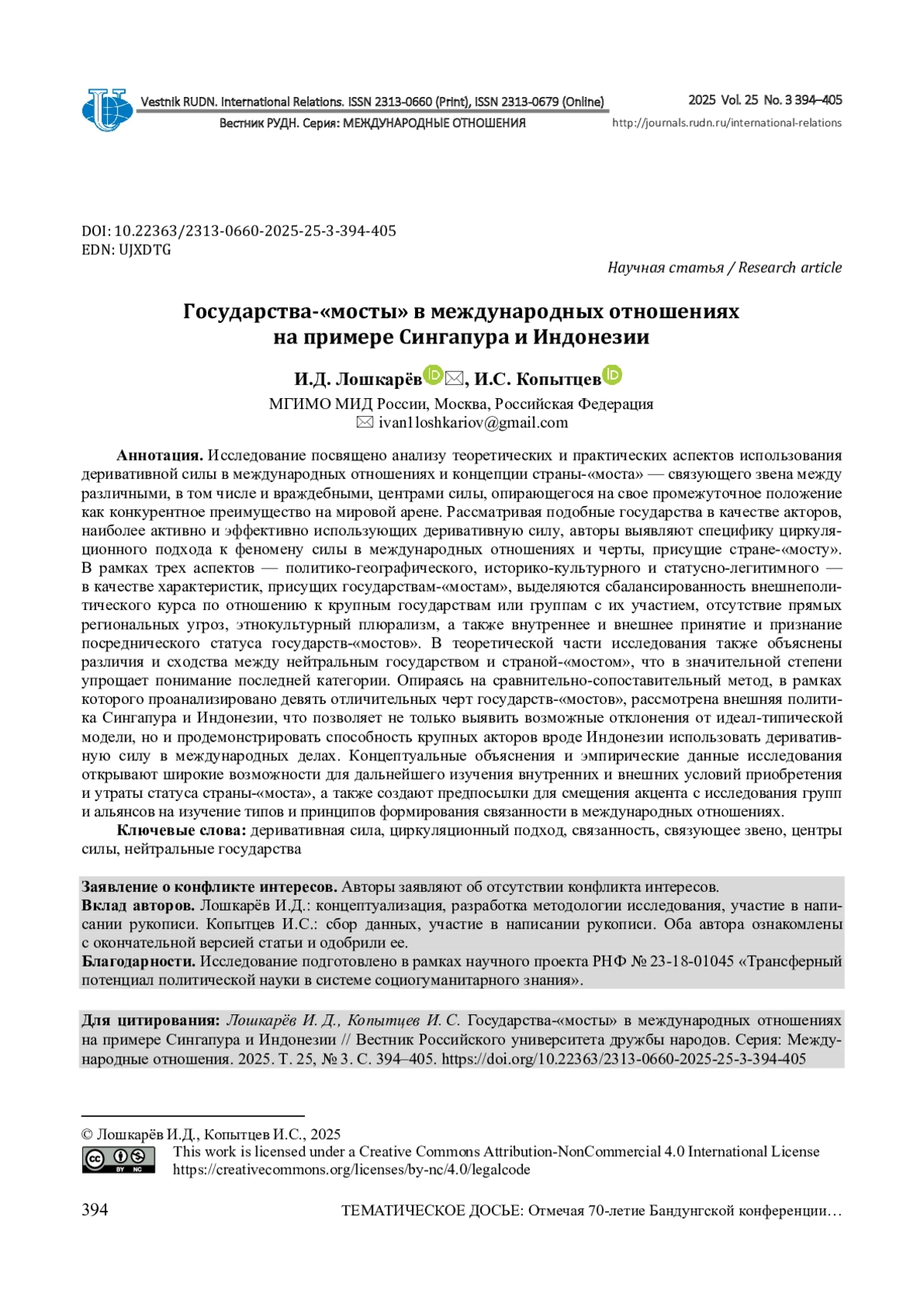 ЛОШКАРЁВ И. Д., КОПЫТЦЕВ И. С. ГОСУДАРСТВА-«МОСТЫ» В МЕЖДУНАРОДНЫХ ОТНОШЕНИЯХ НА ПРИМЕРЕ СИНГАПУРА И ИНДОНЕЗИИ // ВЕСТНИК РОССИЙСКОГО УНИВЕРСИТЕТА ДРУЖБЫ НАРОДОВ. СЕРИЯ: МЕЖДУНАРОДНЫЕ ОТНОШЕНИЯ. 2025. ТОМ 25 № 3