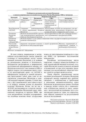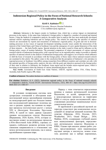 Индонезия - крупнейшая страна Юго-Восточной Азии (ЮВА), оказывающая серьезное влияние на международные процессы в регионе. Вместе с тем формирование внешней политики Индонезии обусловливается целым рядом как внешних, так и внутренних факторов. Используя метод сравнительного анализа, автор ставит целью проанализировать четыре наиболее аналитически разработанные национальные школы, исследующие Индонезию и ее внешнюю политику. Критериями анализа специфики национальных школ выступают оценки экспертов и исследователей региональной политики Индонезии, ее целей и роли в процессах принятия решений по ключевым вопросам регионального развития, включая вопросы безопасности, на фоне пересечения интересов США и Китая в ЮВА и проявления нового пространственного измерения столкновения этих интересов - Индо-Тихоокеанского региона (ИТР). Отдельное внимание уделено исследованиям в области ислама и его влияния на внешнеполитический курс современной Индонезии. Представленное сравнение экспертных оценок различных национальных исследовательских школ индонезийской внешней политики с особым акцентом на региональную политику Индонезии позволяет выявить страновую специфику национальных школ при анализе внешней политики Индонезии и сделать вывод о наборе факторов, которые оказывают влияние или смещают фокус исследования в соответствии с внешнеполитическим курсом тех государств, чьи национальные исследовательские школы рассматриваются в данной статье. Автор приходит к выводу, что восприятие роли и места Индонезии в региональных процессах в ЮВА отличается у исследователей из различных стран и коррелирует не только с национальной спецификой внешнеполитического анализа, но и с теми целями и задачами, которые преследуют во внешней политики их государства по отношению к Индонезии, региону ЮВА и более широкому макрорегиональному пространству, которое становится средой столкновения интересов различных международных игроков.