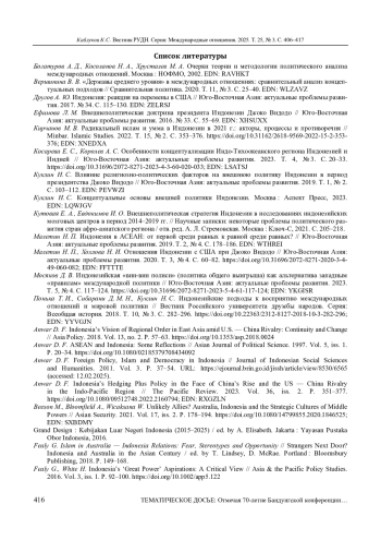 17. Anwar D. F. Indonesia’s Hedging Plus Policy in the Face of China’s Rise and the US - China Rivalry in the Indo-Pacific Region // The Pacific Review. 2023. Vol. 36, iss. 2. P. 351-377. ;. DOI: 10.1080/09512748.2022.2160794 EDN: RXGZLN